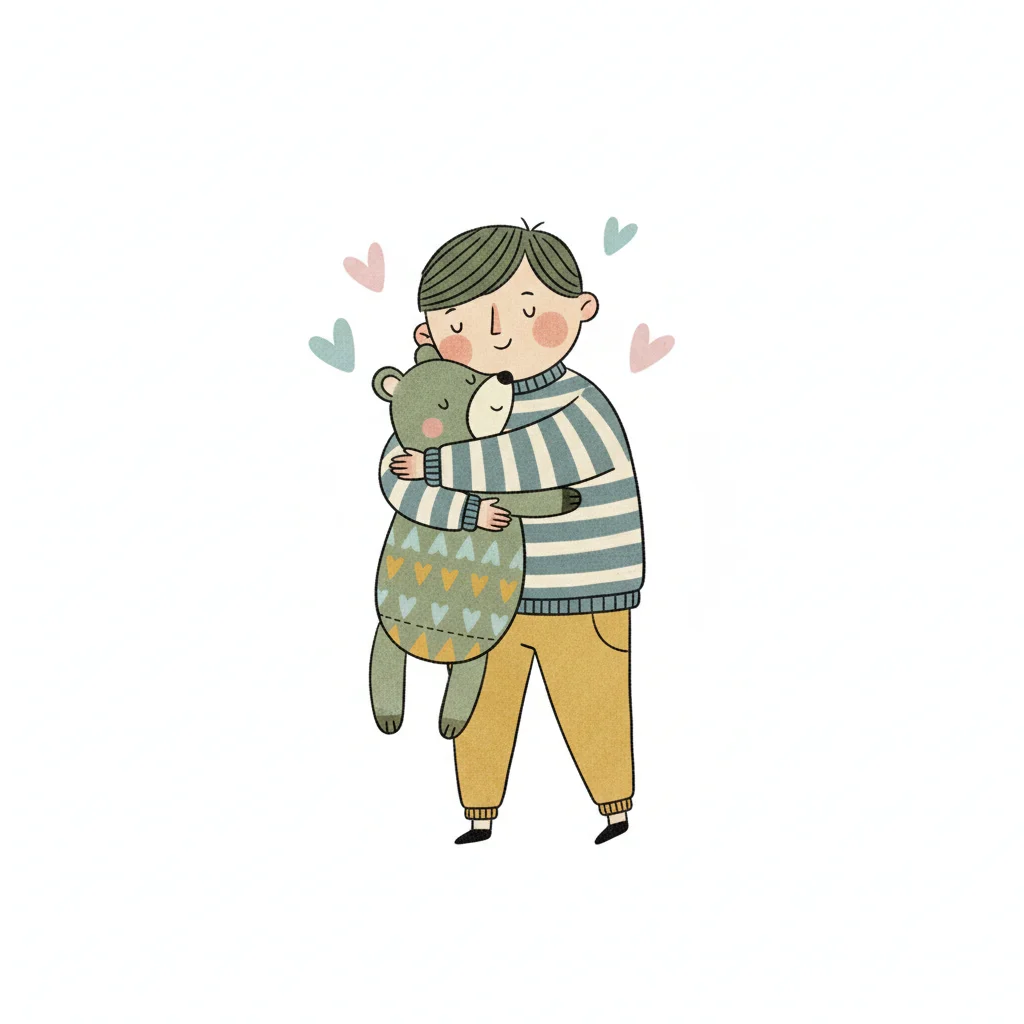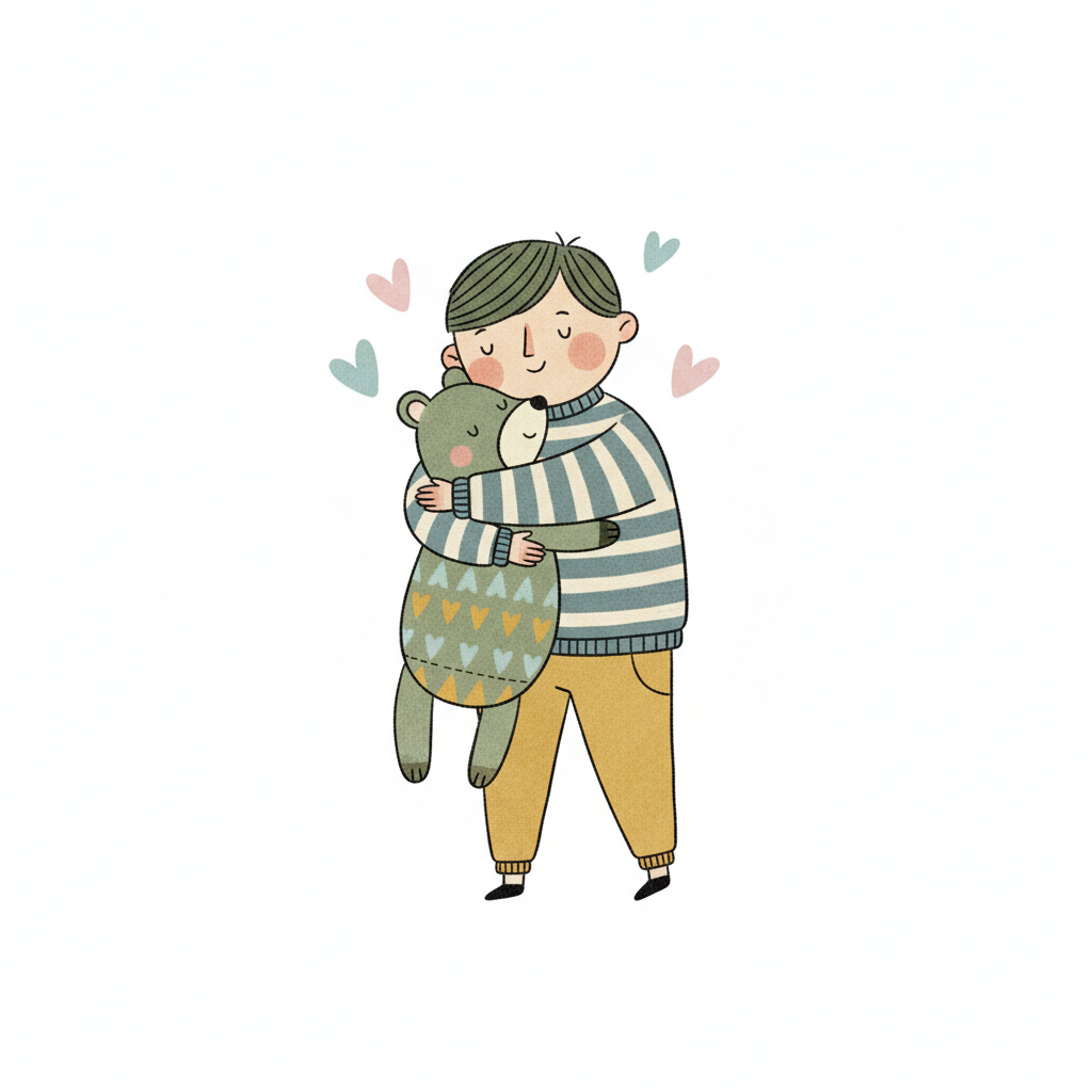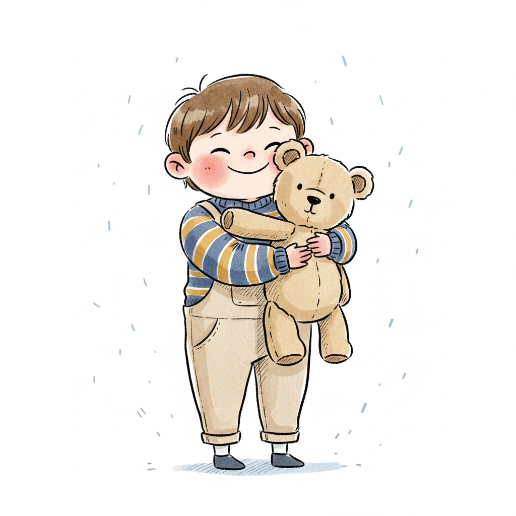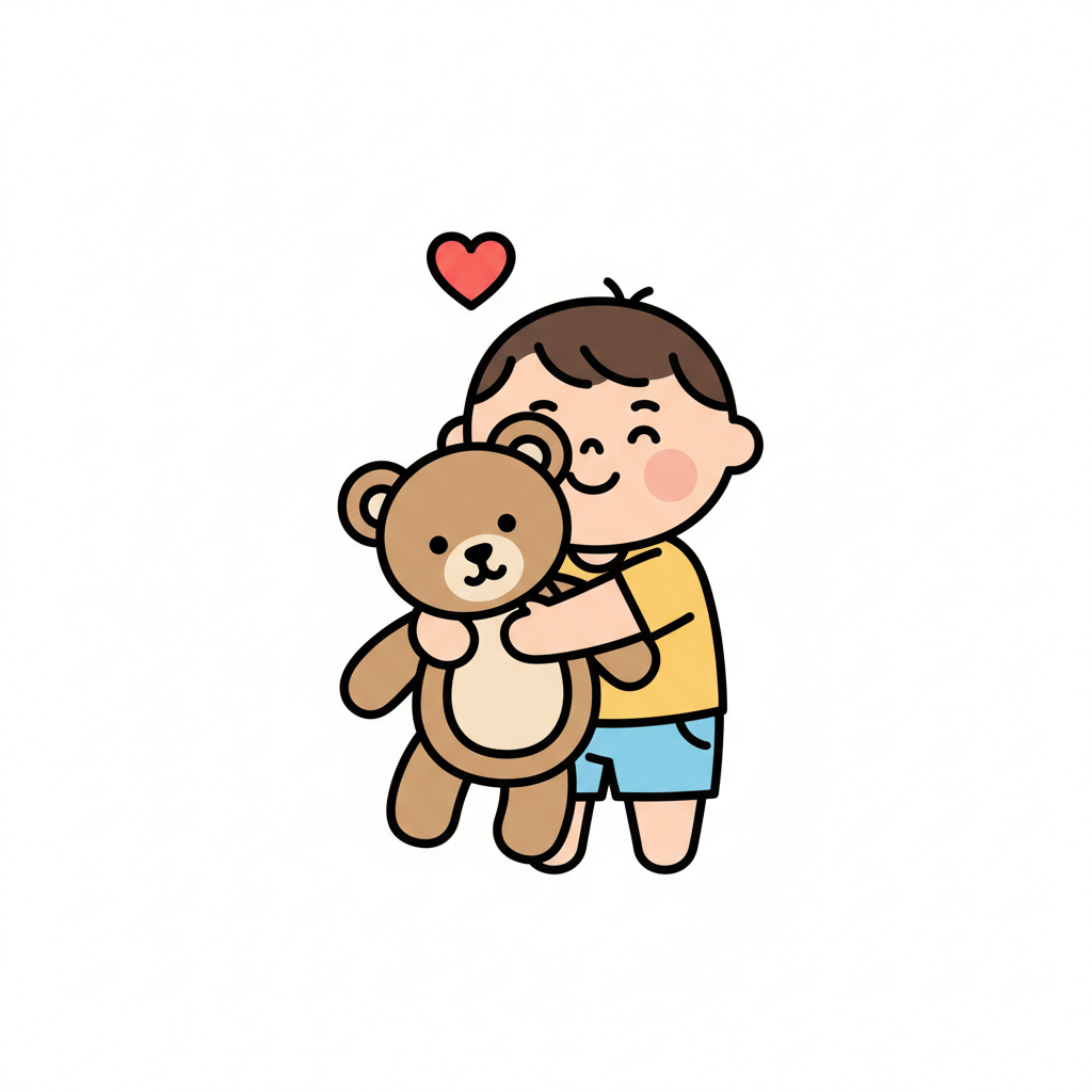 Ein süßer Cartoon-Junge umarmt liebevoll einen Teddybären, mit einem Herz darüber.