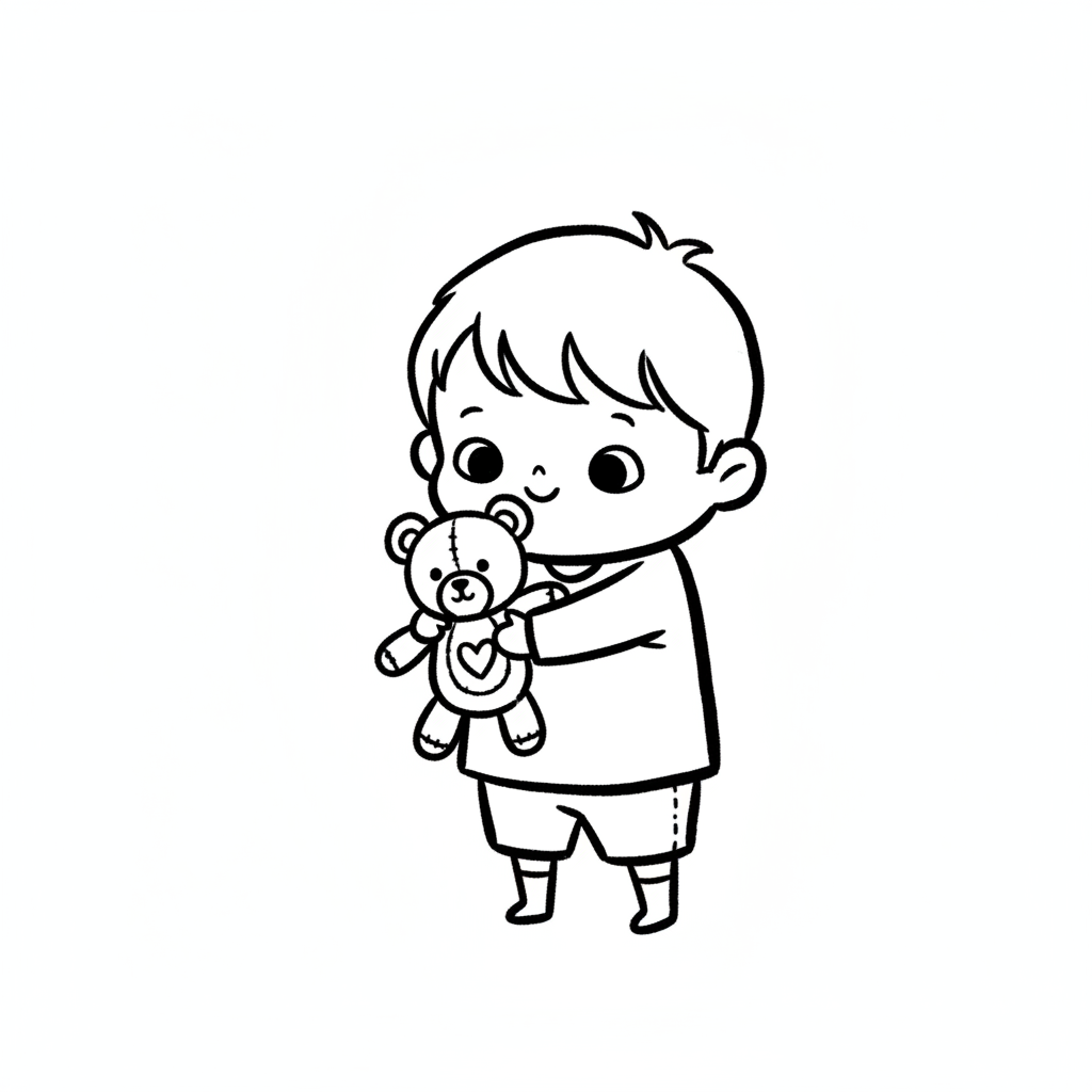 Strichzeichnung eines lächelnden Jungen, der einen Teddybär mit Herz hält.