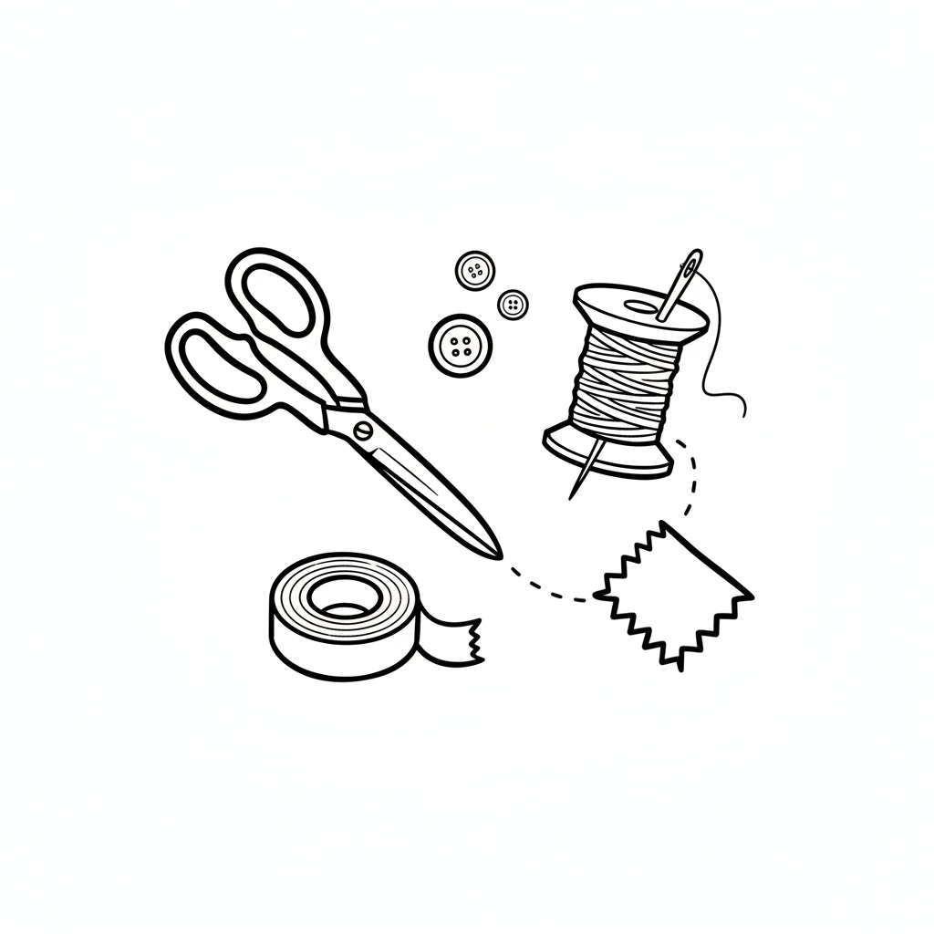 Schwarz-weiße Line-Art-Illustration von Nähutensilien: Schere, Garn, Nadel, Knöpfe, Maßband, Stoff.