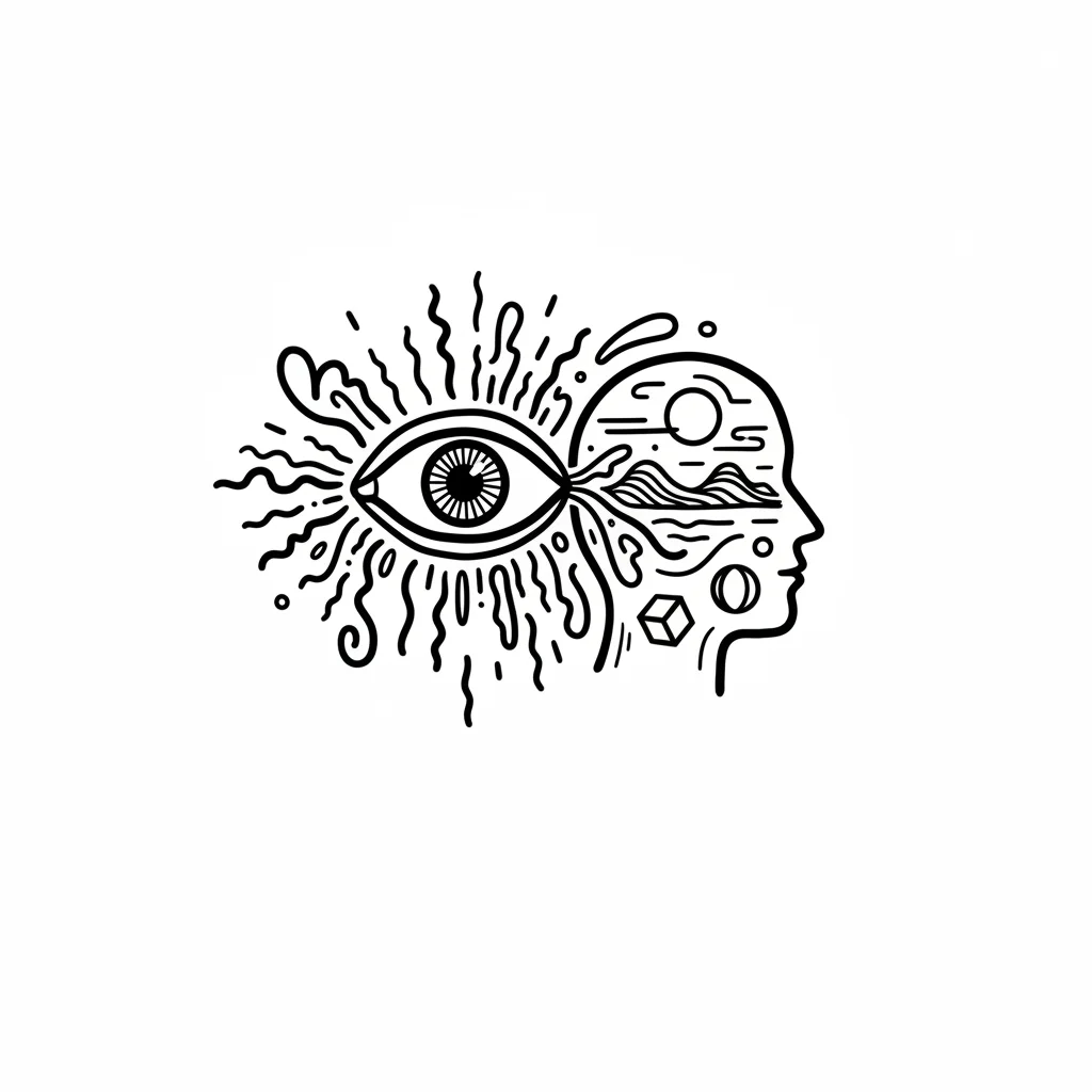 Line-Art: Ein strahlendes Auge blickt in einen Kopf, der mit abstrakten Gedanken und Landschaften gefüllt ist.