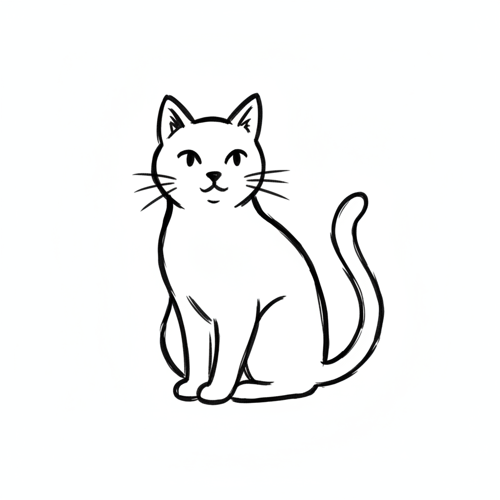 Eine einfache Zeichnung einer sitzenden Katze mit einem freundlichen Ausdruck.