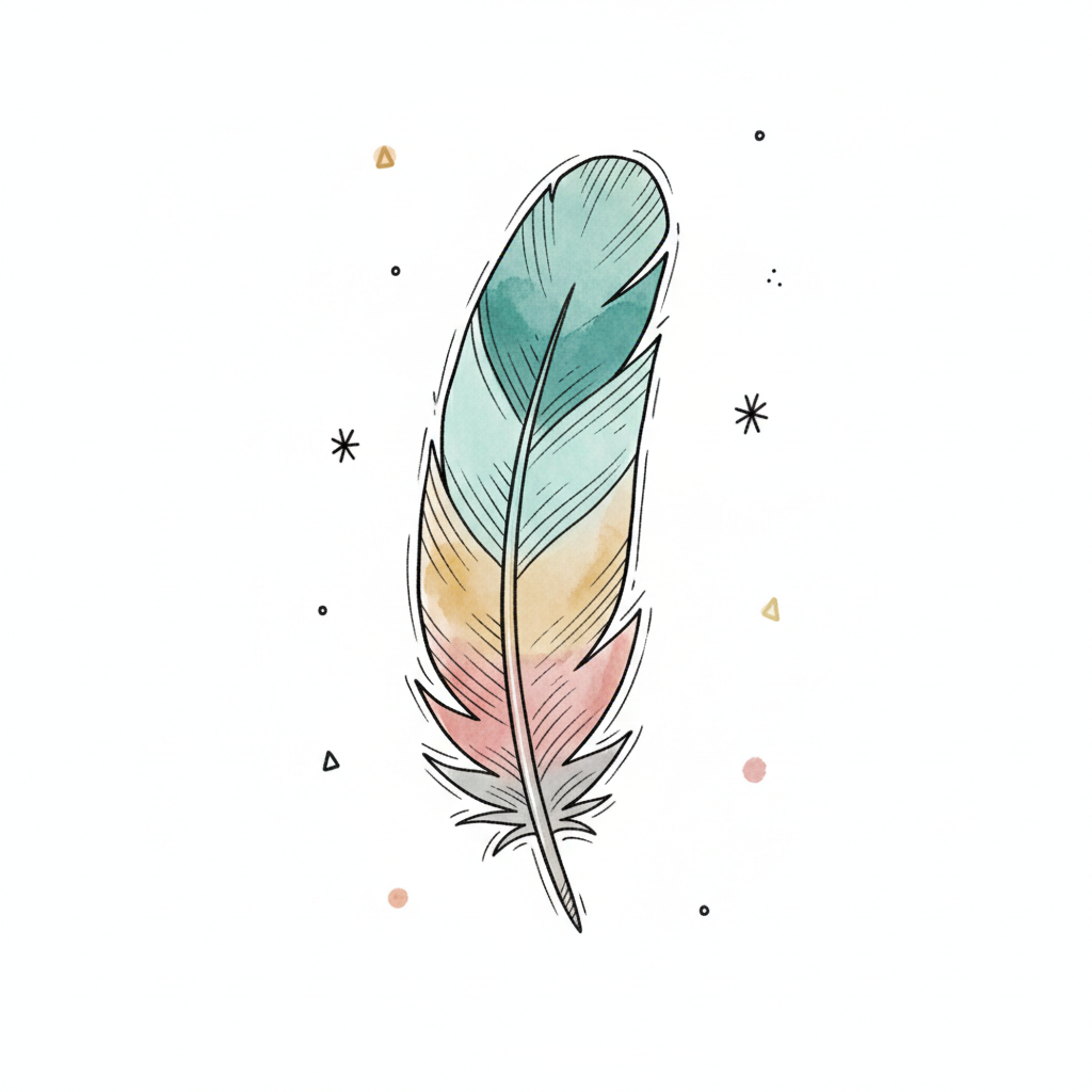 Zarte Aquarellfeder in Türkis, Gelb und Rosa mit feinen Linien und kleinen Dekoelementen.