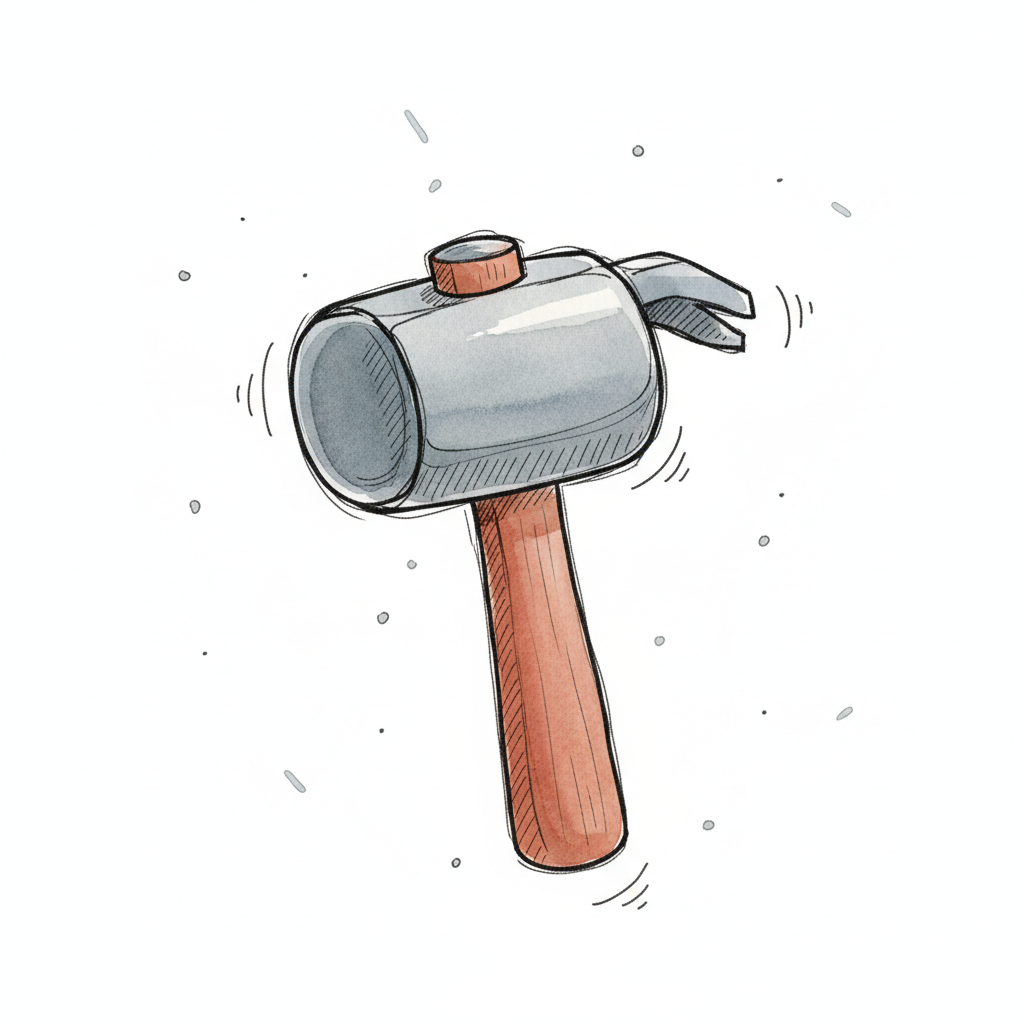 Handgezeichneter Hammer mit grauem Kopf und braunem Holzgriff, umgeben von Bewegungslinien.