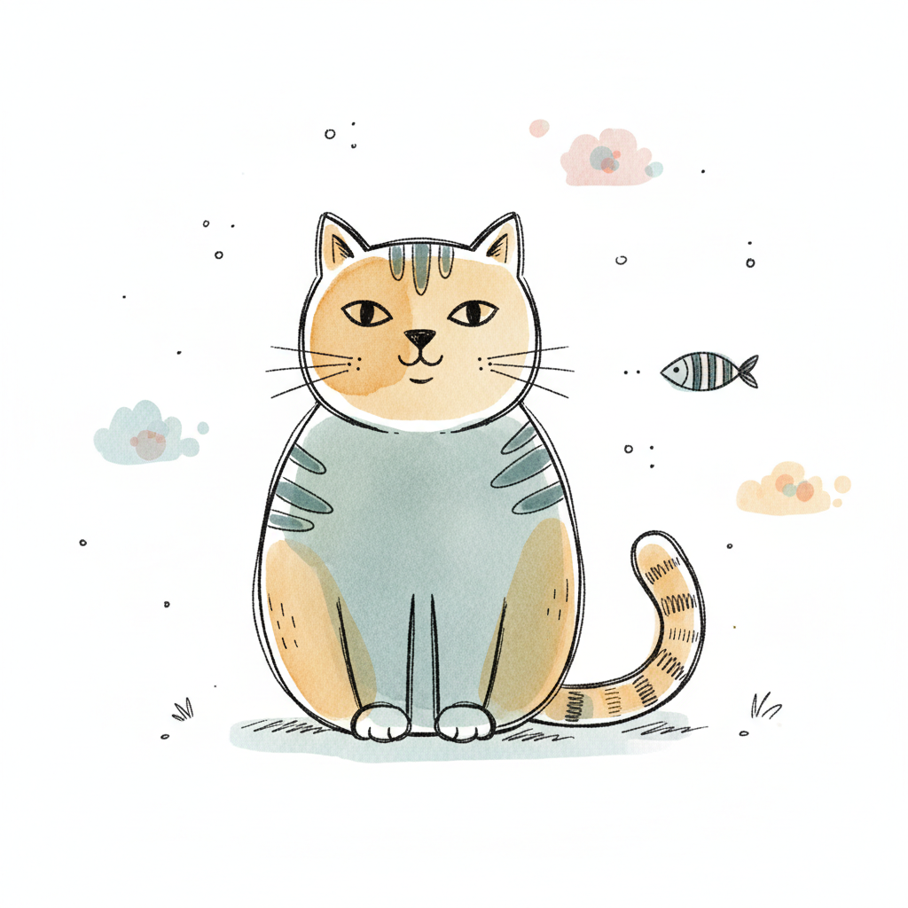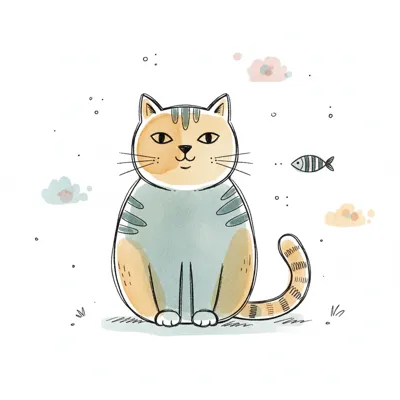 Süße, sitzende Katze in Aquarell- und Linienkunst mit kleinen Wolken und Fisch.