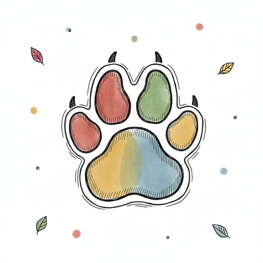 Bunter Pfotenabdruck im Aquarell-Stil mit skizzenhaften Linien und kleinen Blättern auf weißem Grund.