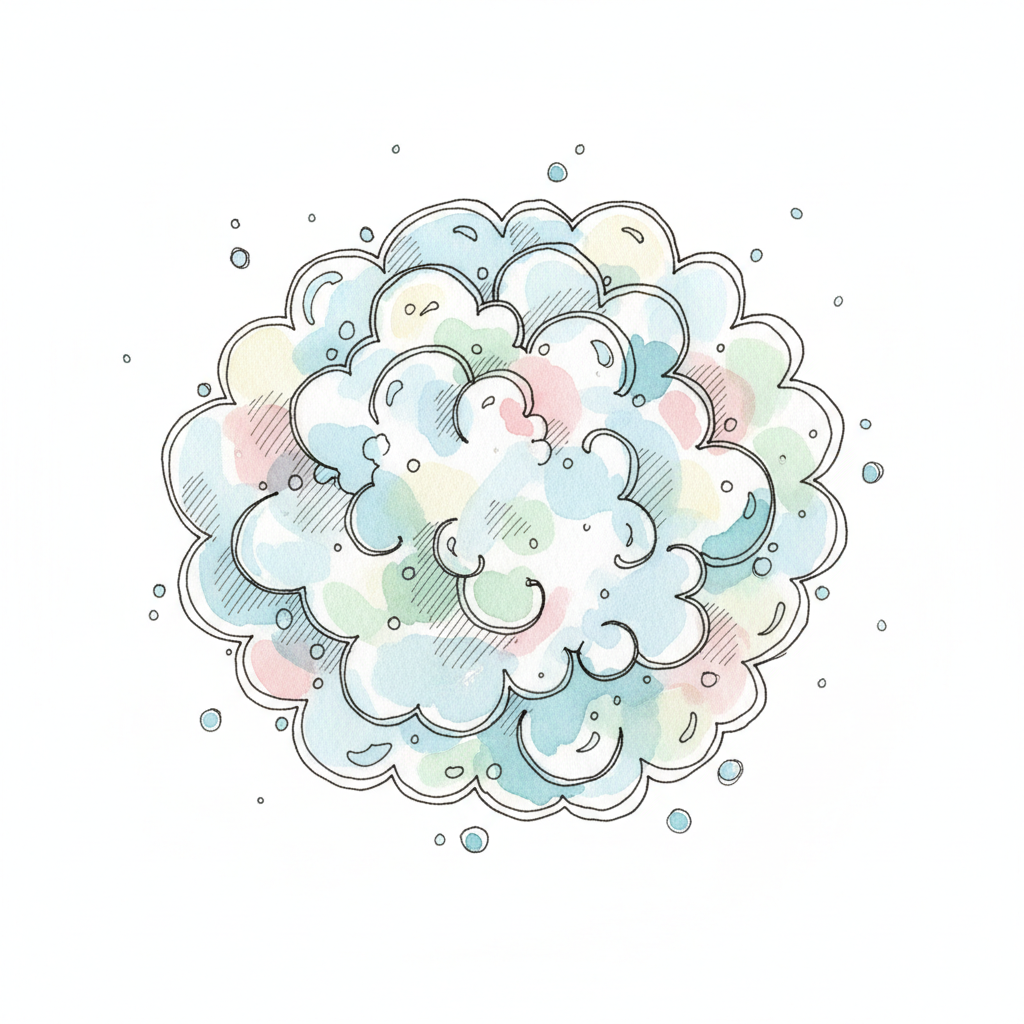 Bunte, weiche Wolke oder Schaumblase mit Aquarellfarben und feinen Linien auf weißem Grund.
