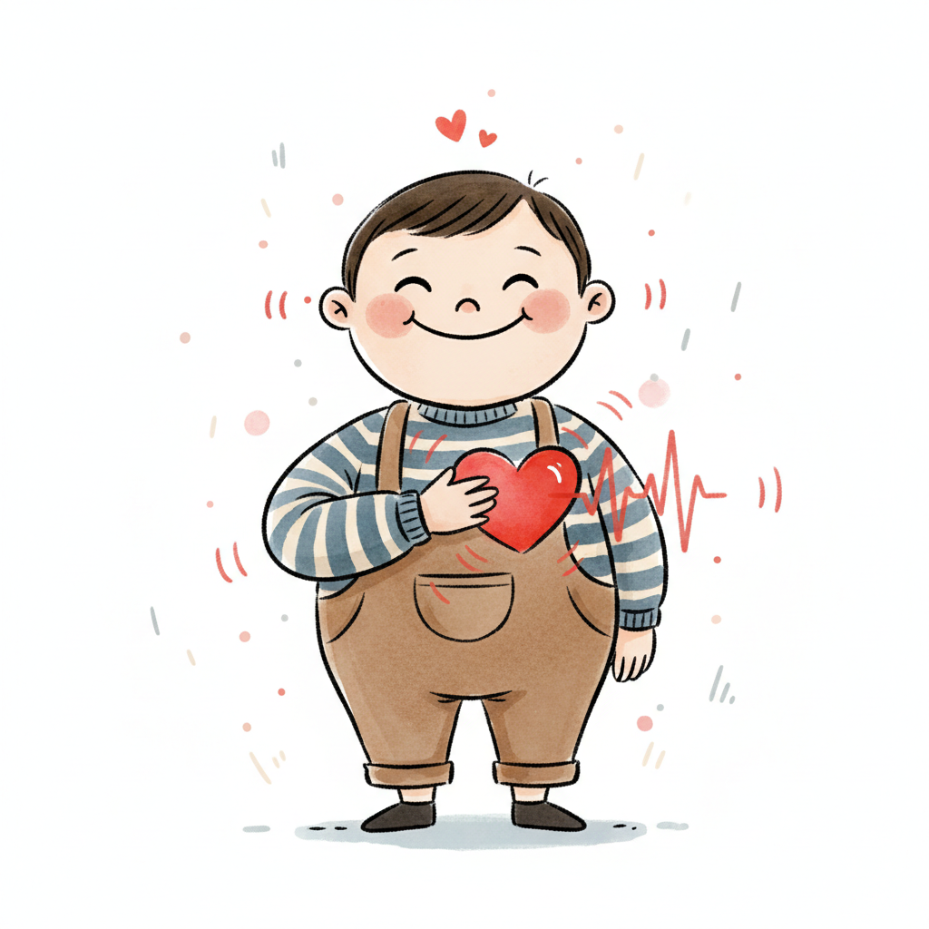 Ein lächelnder Cartoon-Junge hält ein rotes Herz an seine Brust, umgeben von Herzschlaglinien.