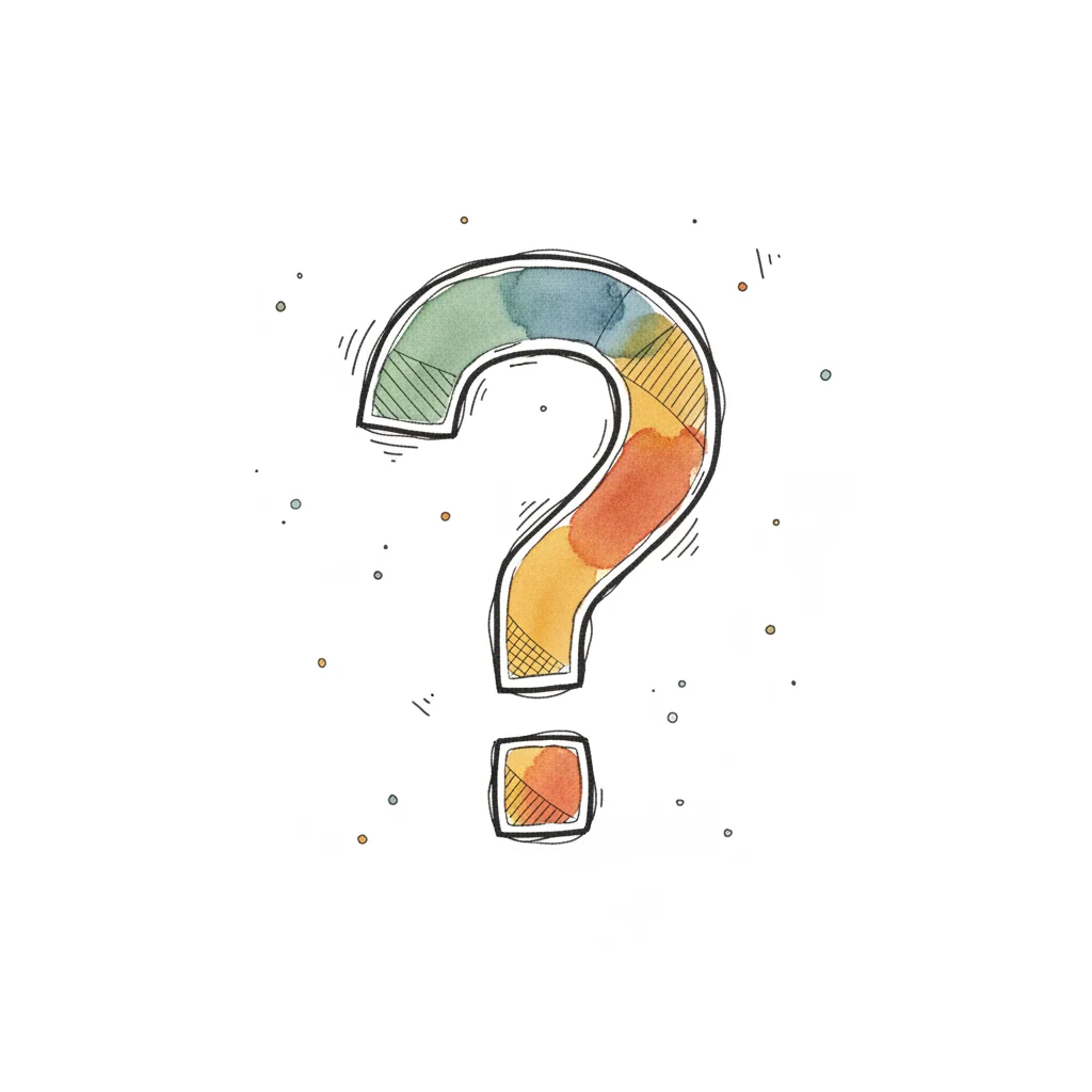 Buntes, handgemaltes Fragezeichen in Aquarell-Optik mit skizzenhaften Linien auf weißem Grund.