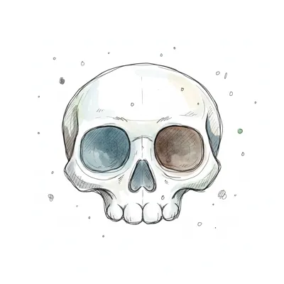 Stilisierter Schädel in Aquarellfarben mit skizzenhaften Linien und Farbspritzern auf weißem Grund.