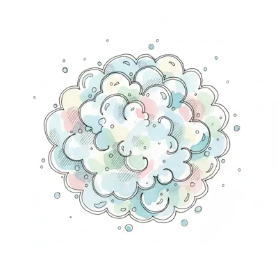 Handgezeichnete, flauschige Wolke in Pastellfarben mit zarten Linien und kleinen Sternen.