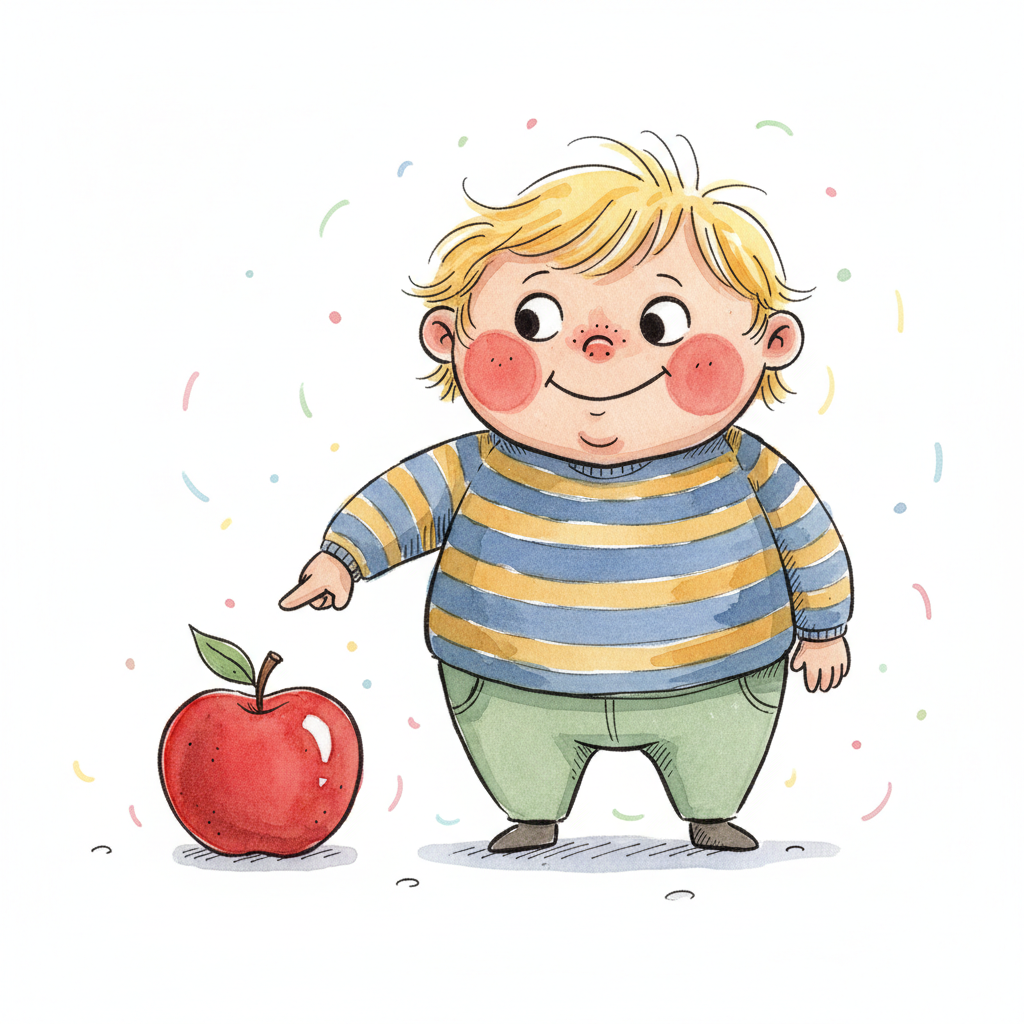 Niedlicher Cartoon-Junge mit blonden Haaren und gestreiftem Pullover zeigt auf einen roten Apfel.