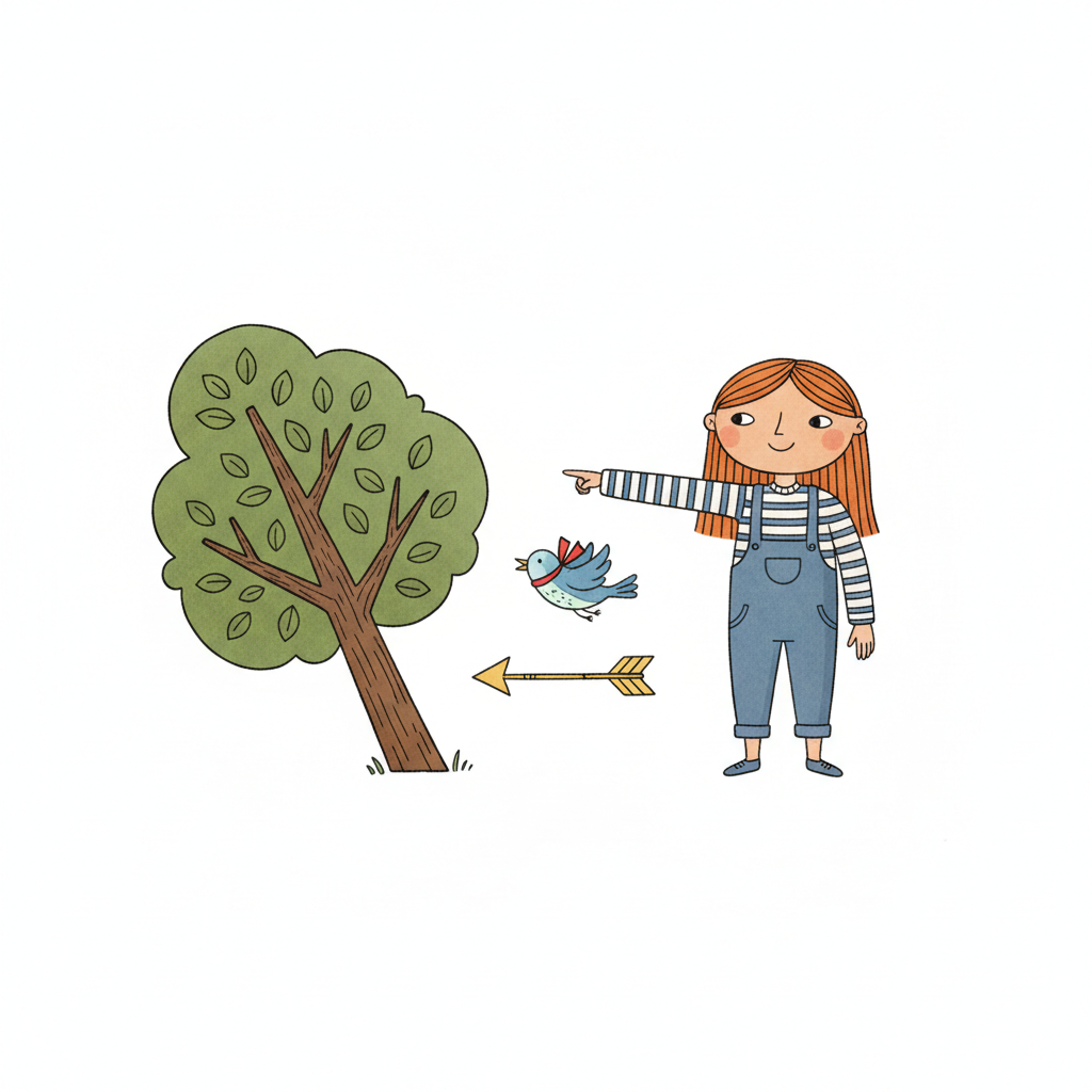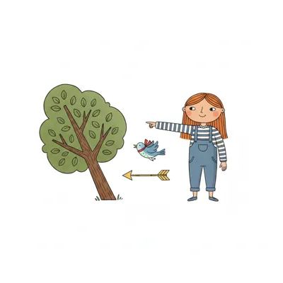 Mädchen zeigt nach links auf einen Vogel und Baum, ein Pfeil verstärkt die Richtung.
