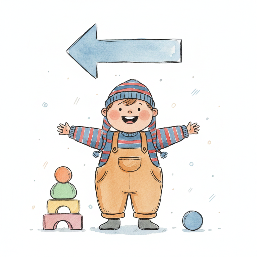 Fröhliches Kind in Winterkleidung mit Pfeil nach links, Bauklötzen und Ball.