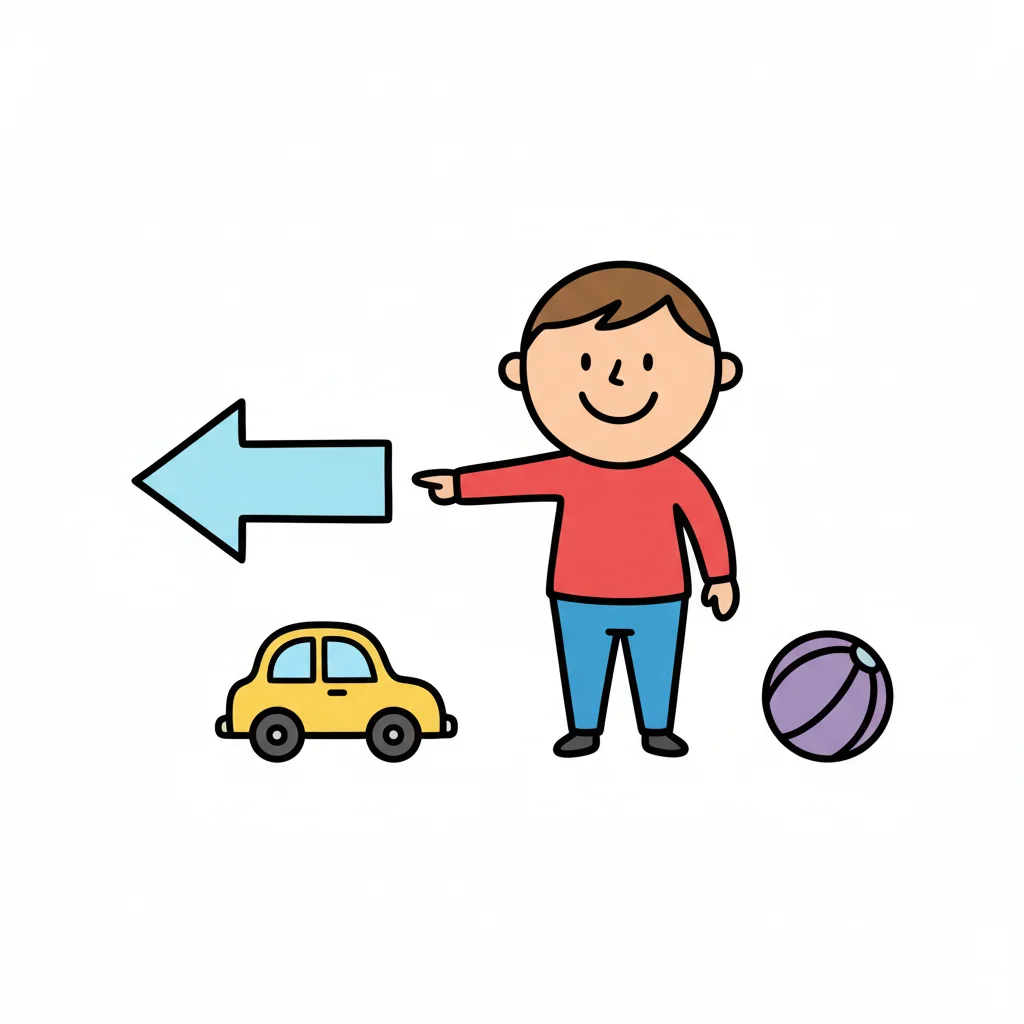 Junge zeigt nach links auf ein Spielzeugauto, daneben liegt ein Ball.