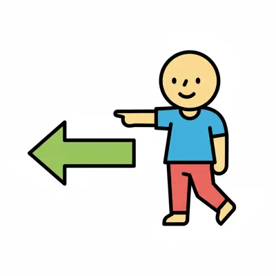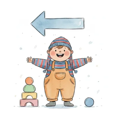 Ein lächelnder Junge in Latzhose und Mütze zeigt auf ein rundes Schild mit einem Linkspfeil.