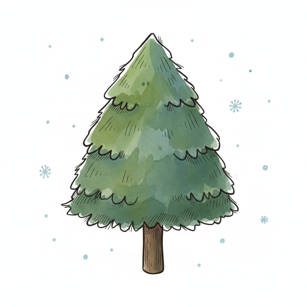 Aquarell-Illustration eines grünen Tannenbaums mit Schneeflocken auf weißem Hintergrund.