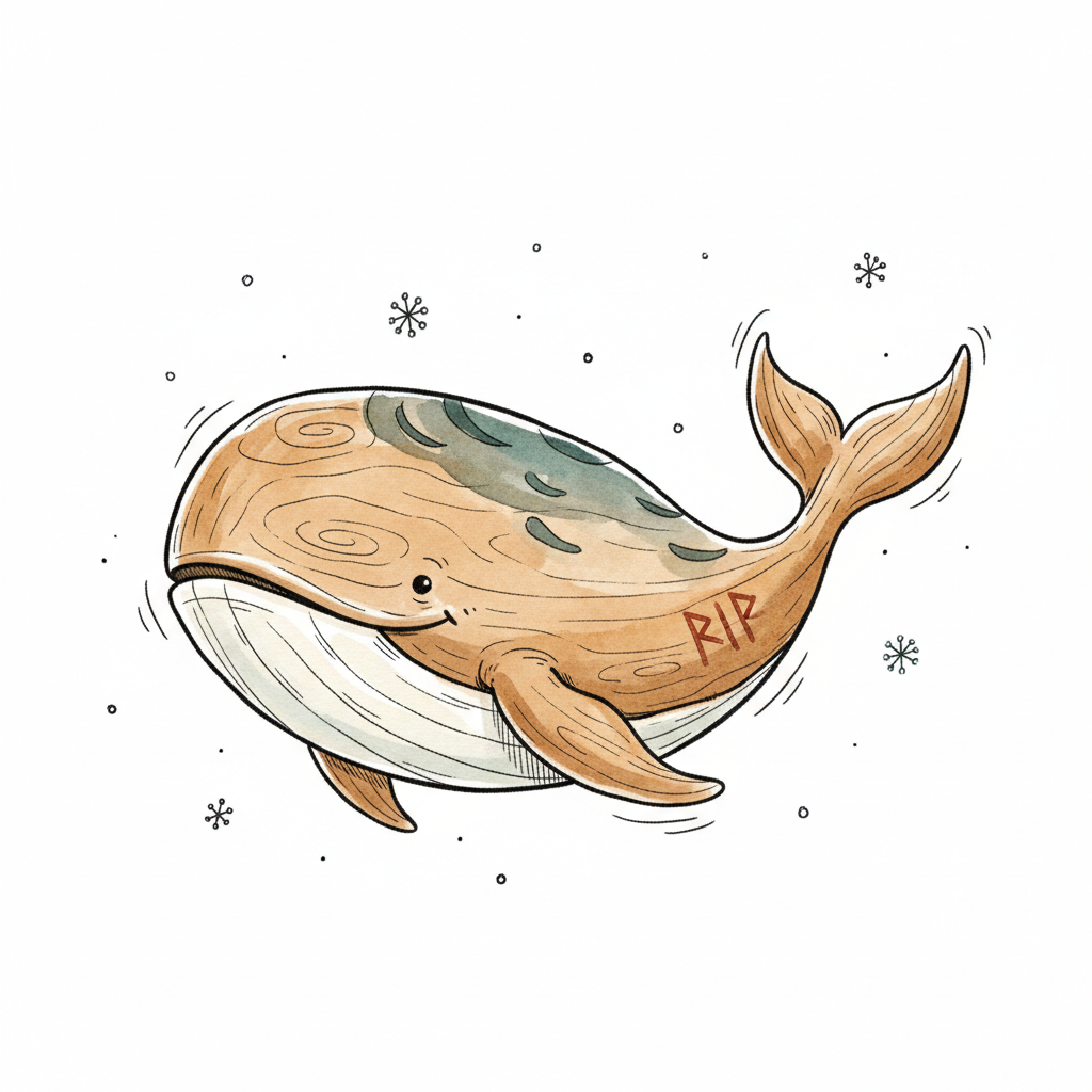 Ein lächelnder Cartoon-Wal mit Holzmaserung und 'RIP'-Gravur, umgeben von Schneeflocken.