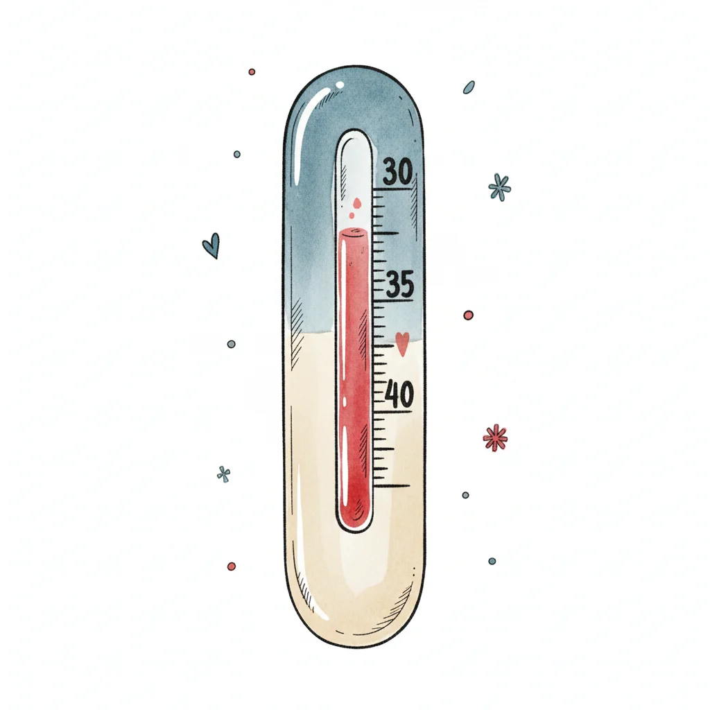 Aquarell-Illustration eines Thermometers, das Fieber anzeigt, mit kleinen Herzen und Schneeflocken.