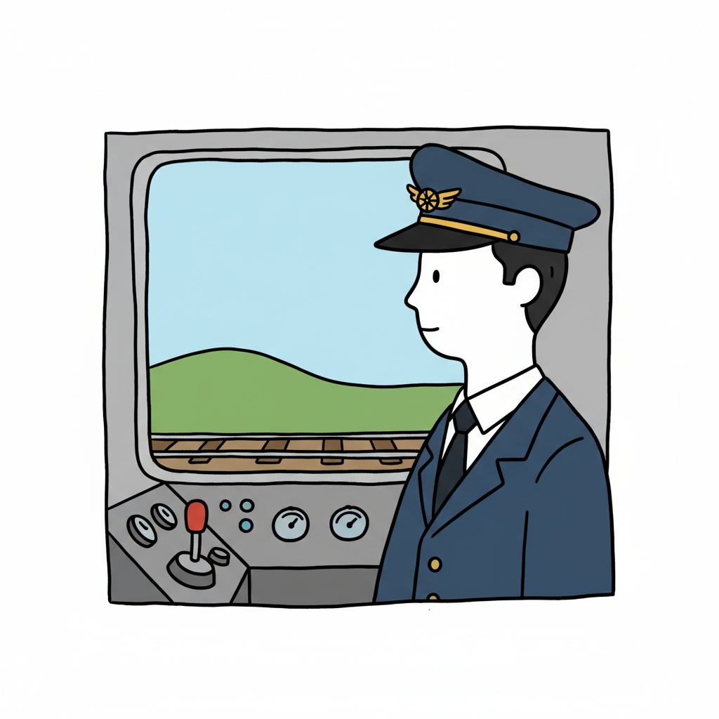 Ein Lokführer schaut aus dem Führerstand auf die Landschaft.