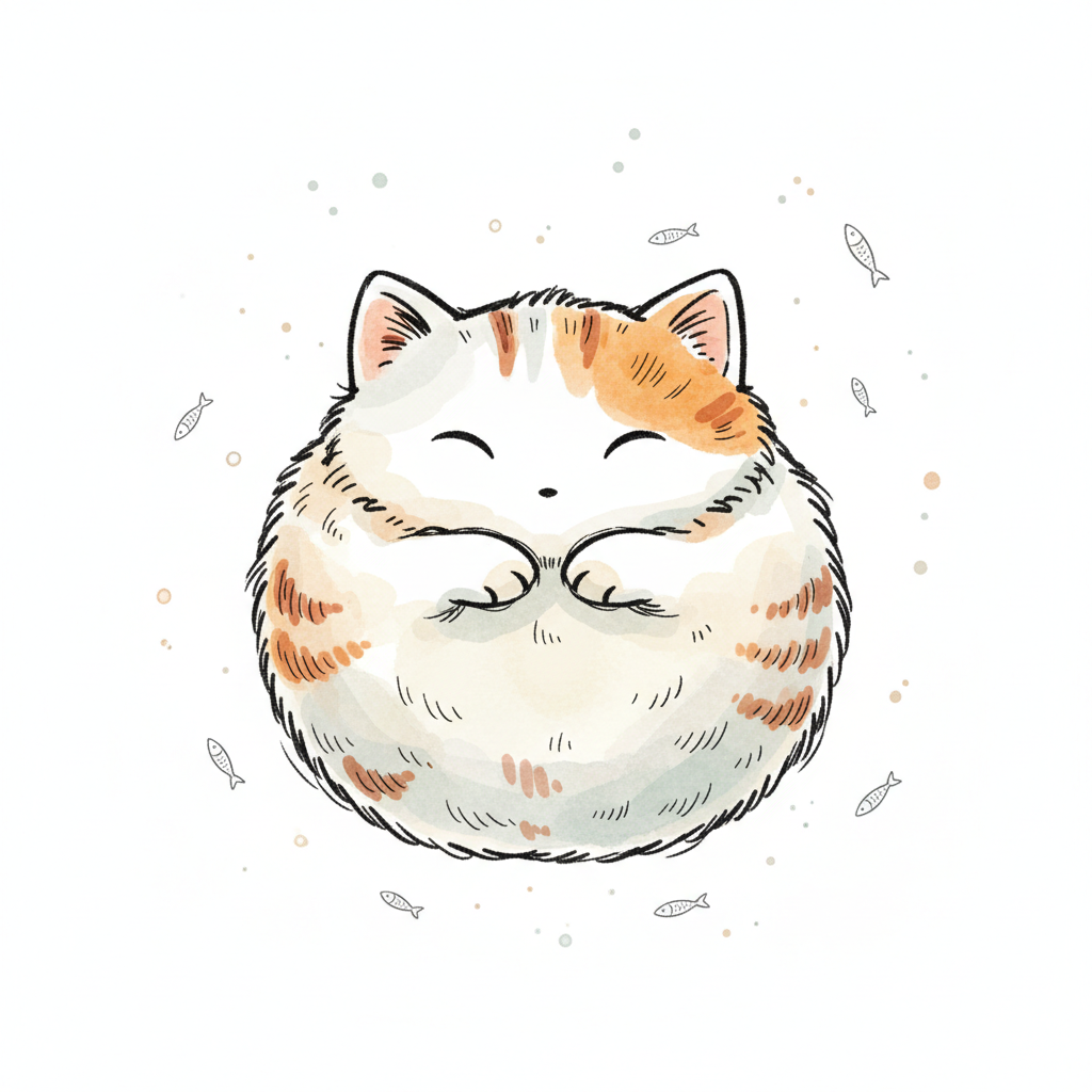 Niedliche, runde Katze mit geschlossenen Augen und kleinen Fischen schwebend in Aquarell-Optik.
