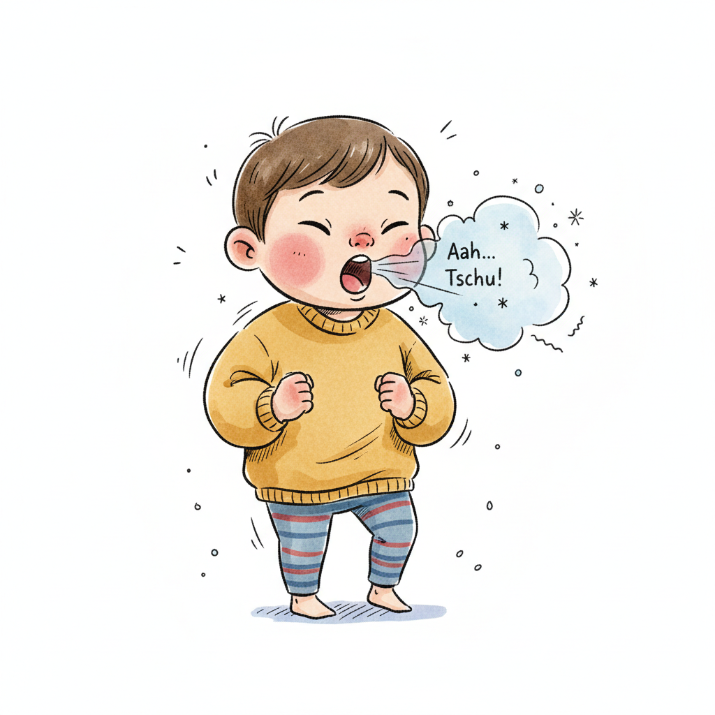 Illustration eines niesenden Kindes mit geschlossenen Augen und einer "Aah... Tschu!" Sprechblase.