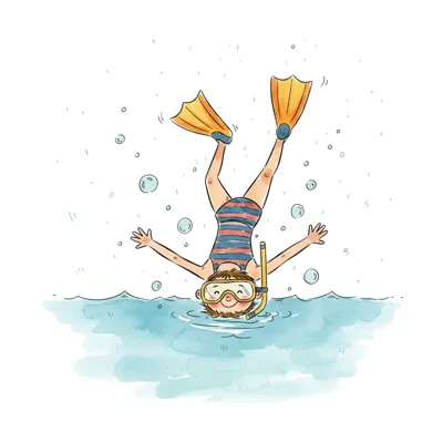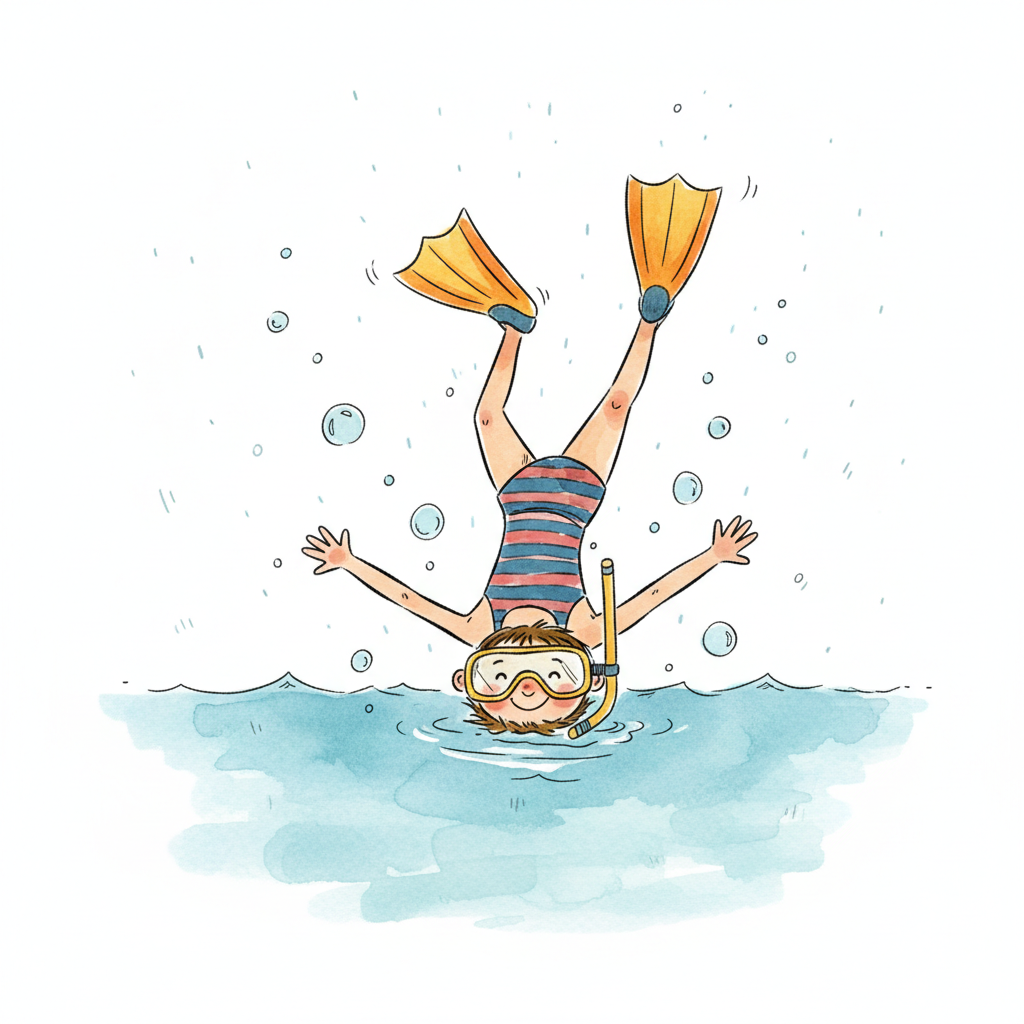 Fröhliches Kind taucht kopfüber mit Schnorchel und Flossen im Wasser.