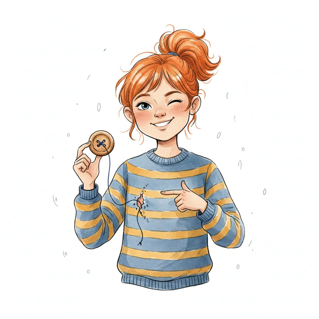 Cartoonmädchen mit rotem Haar, Knopf in Hand, zeigt auf fehlenden Knopf am Pullover.