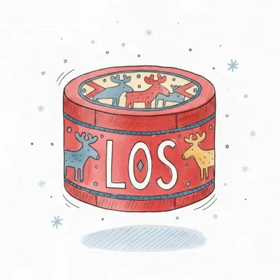 Rote Dose mit Elch-Motiven und dem Schriftzug "LOS", umgeben von Schneeflocken in Aquarellstil.