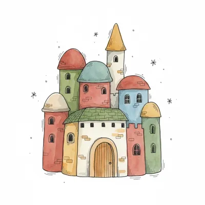 Aquarell-Illustration eines bunten, märchenhaften Schlosses mit vielen Türmen und Sternen.