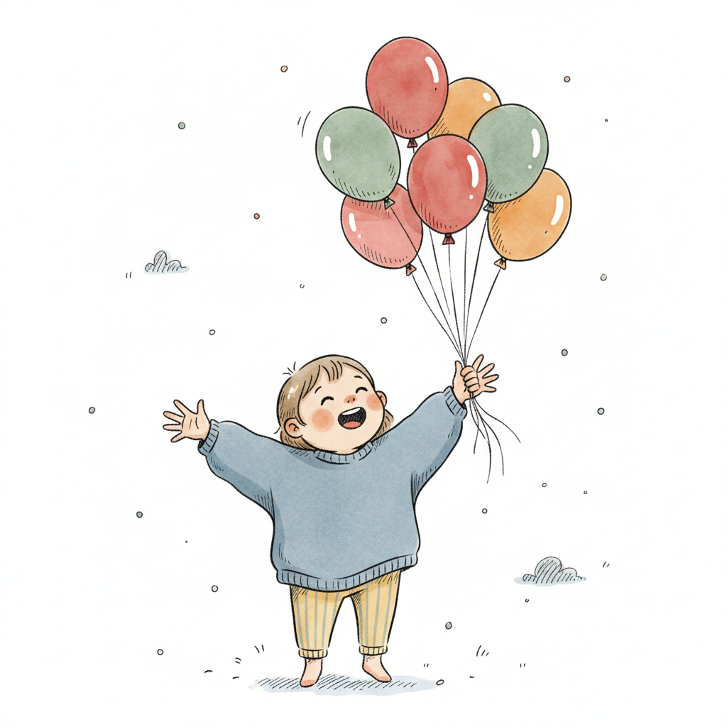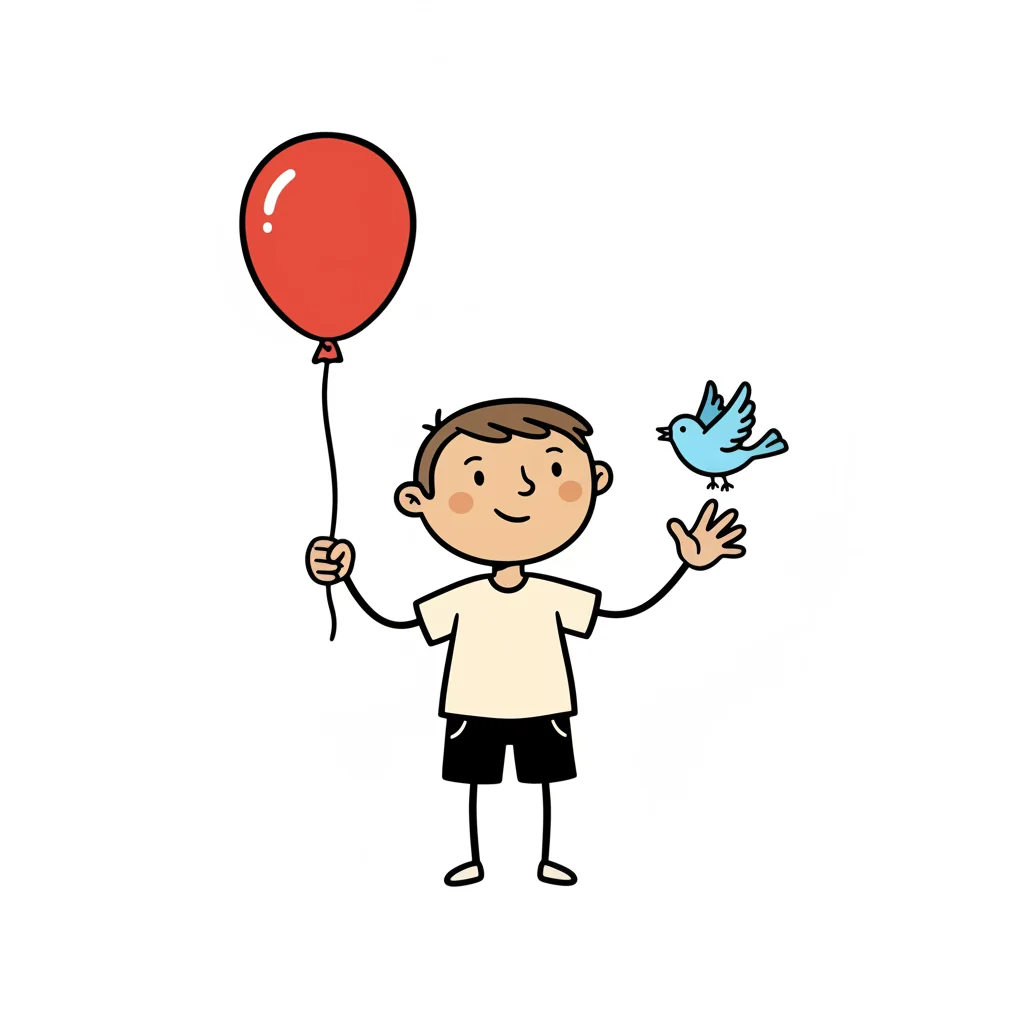 Ein Junge mit Ballons und einem kleinen Vogel, der fröhlich wirkt.