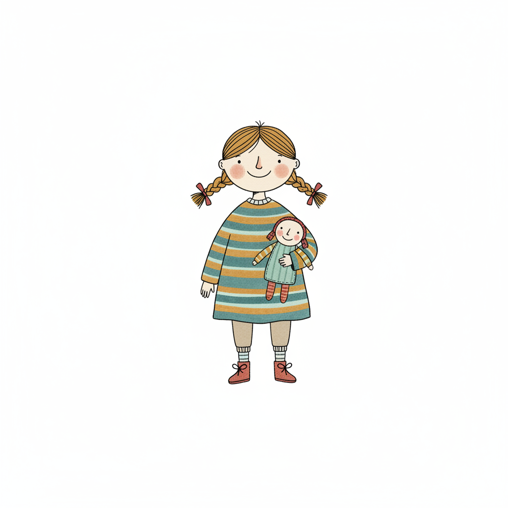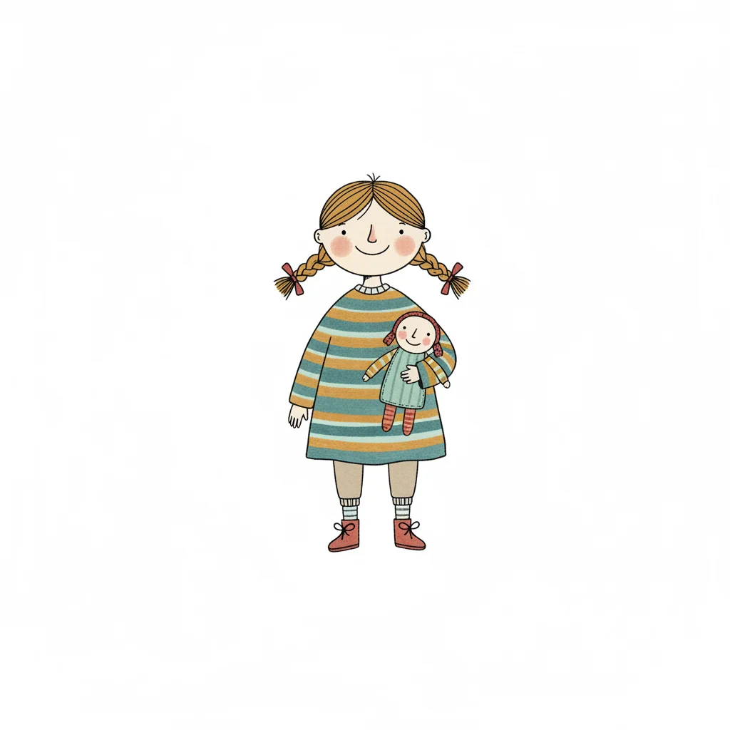Ein Mädchen mit Zöpfen trägt ein gestreiftes Kleid und hält eine Puppe.