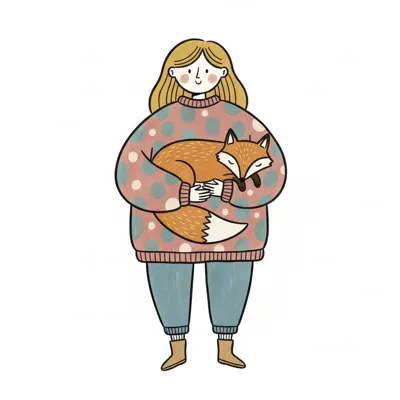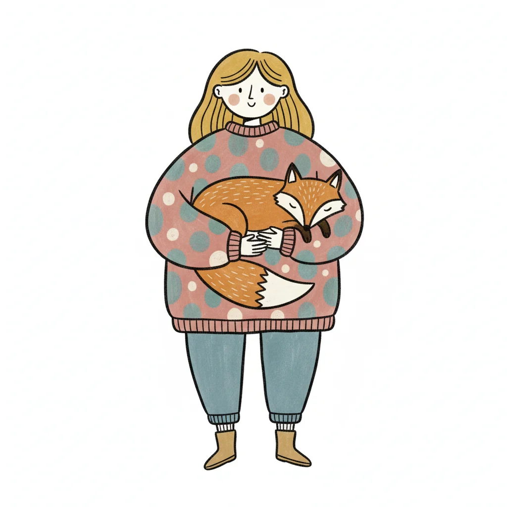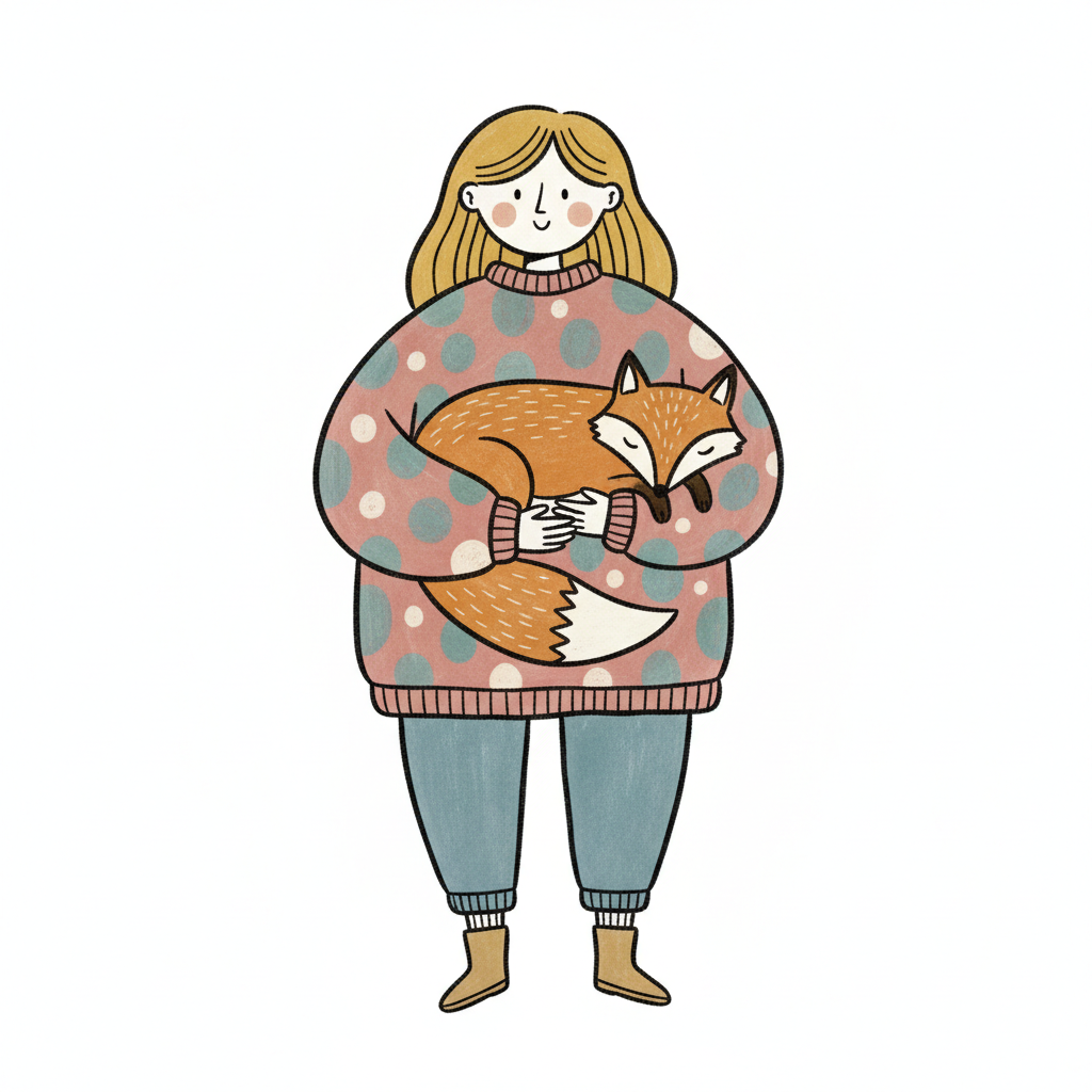 Ein Mädchen mit Pullover hält einen Fuchs in den Armen.