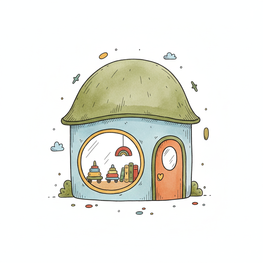 Niedliches, märchenhaftes Haus im Aquarellstil mit rundem Fenster, Spielzeug und Büchern.