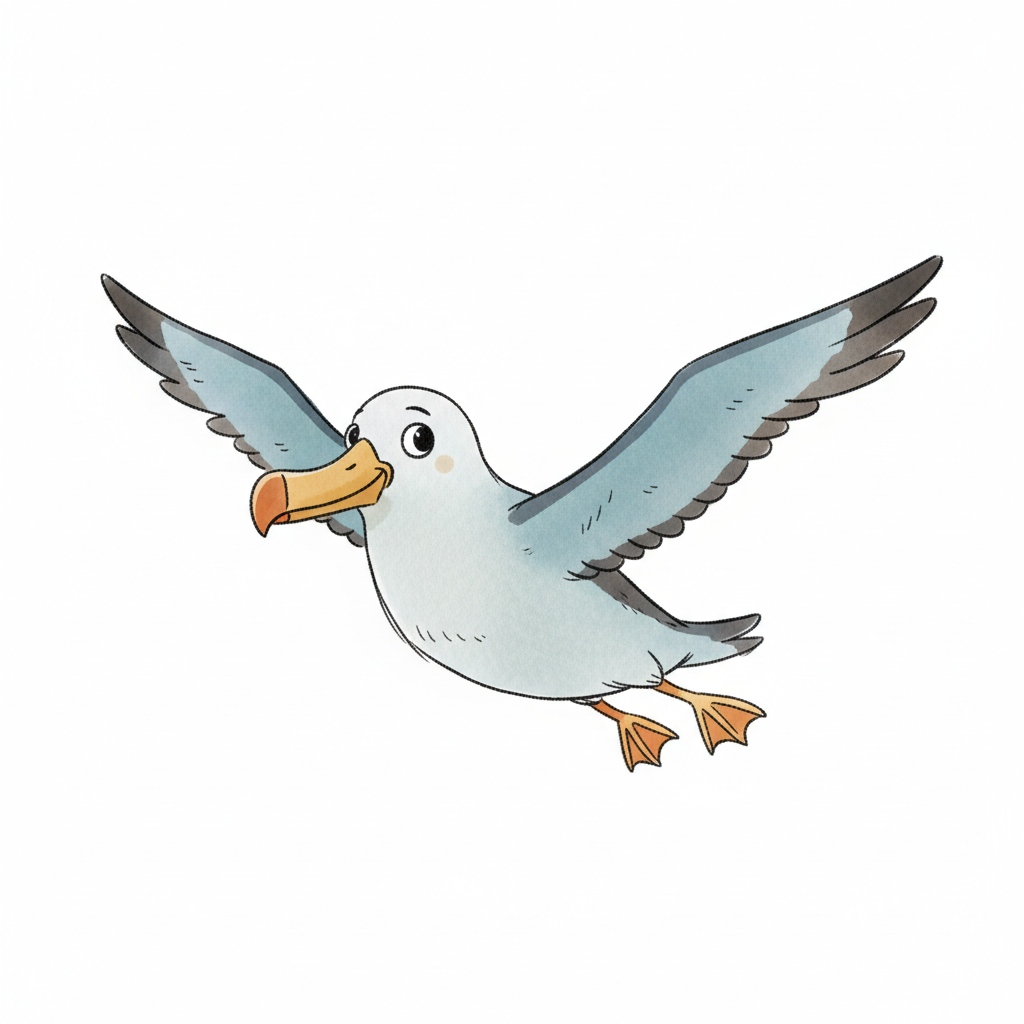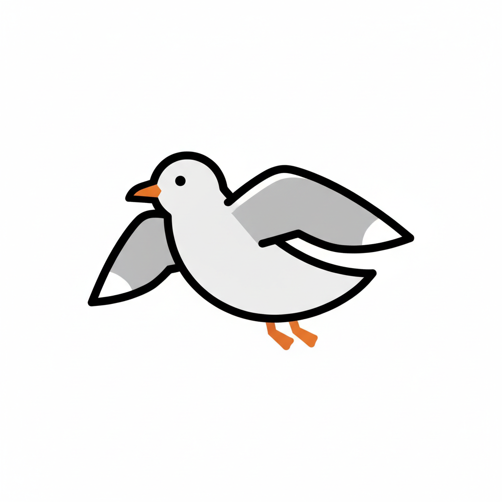 Eine cartoonartige Möwe fliegt mit ausgebreiteten Flügeln.