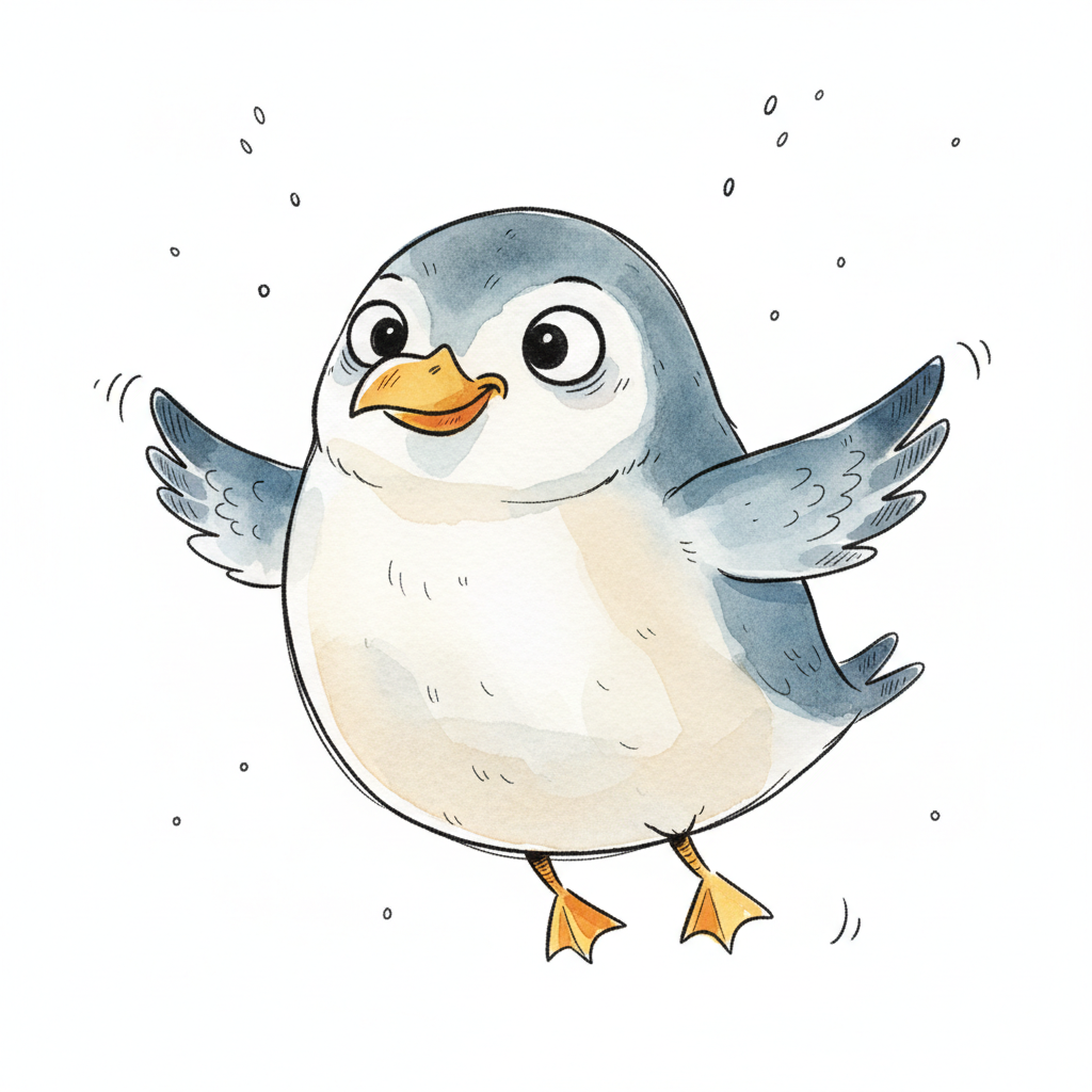 Ein fröhlicher, cartoonartiger Vogel mit flauschigem Körper und breitem Lächeln.