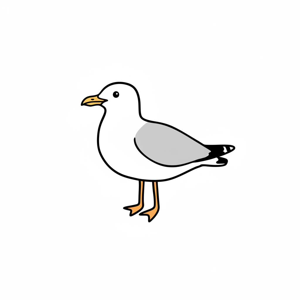 Eine cartoonartige Darstellung einer Möwe mit grauem Gefieder.