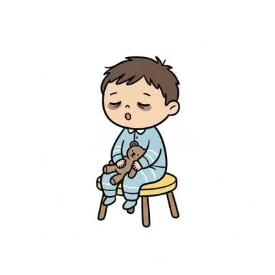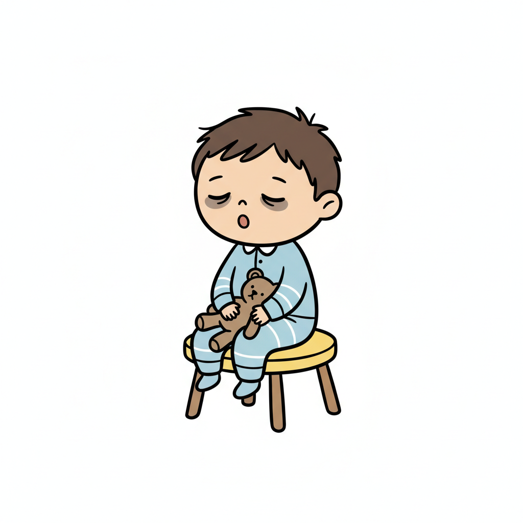 Müder Junge im Schlafanzug mit Teddybär sitzt auf Hocker und gähnt.