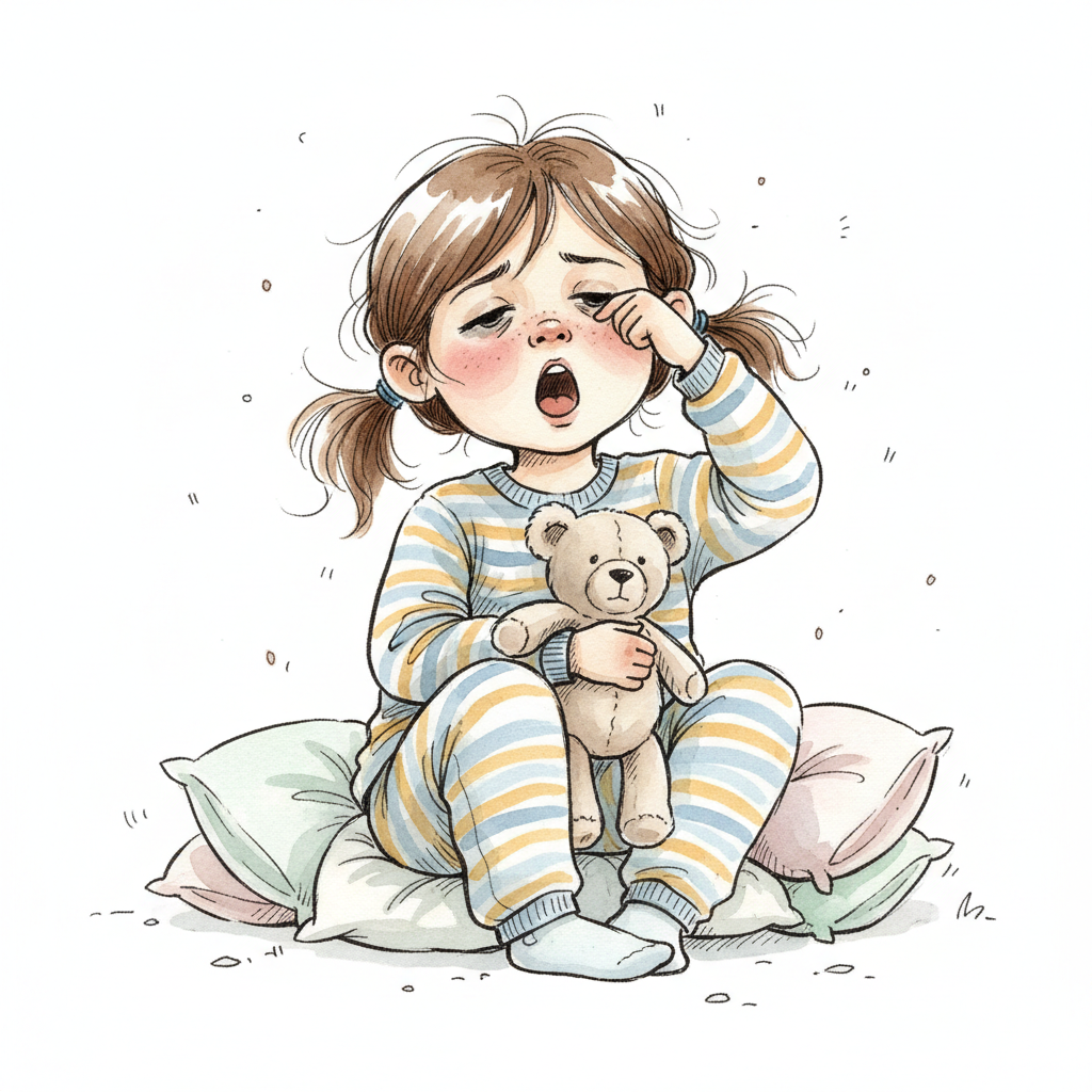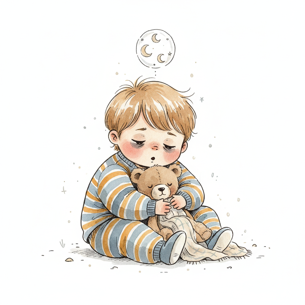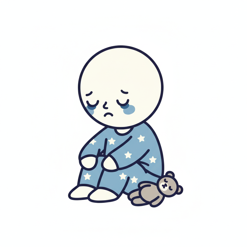 Traurige Cartoon-Figur in blauem Sternen-Pyjama weint, ein Teddybär liegt daneben.