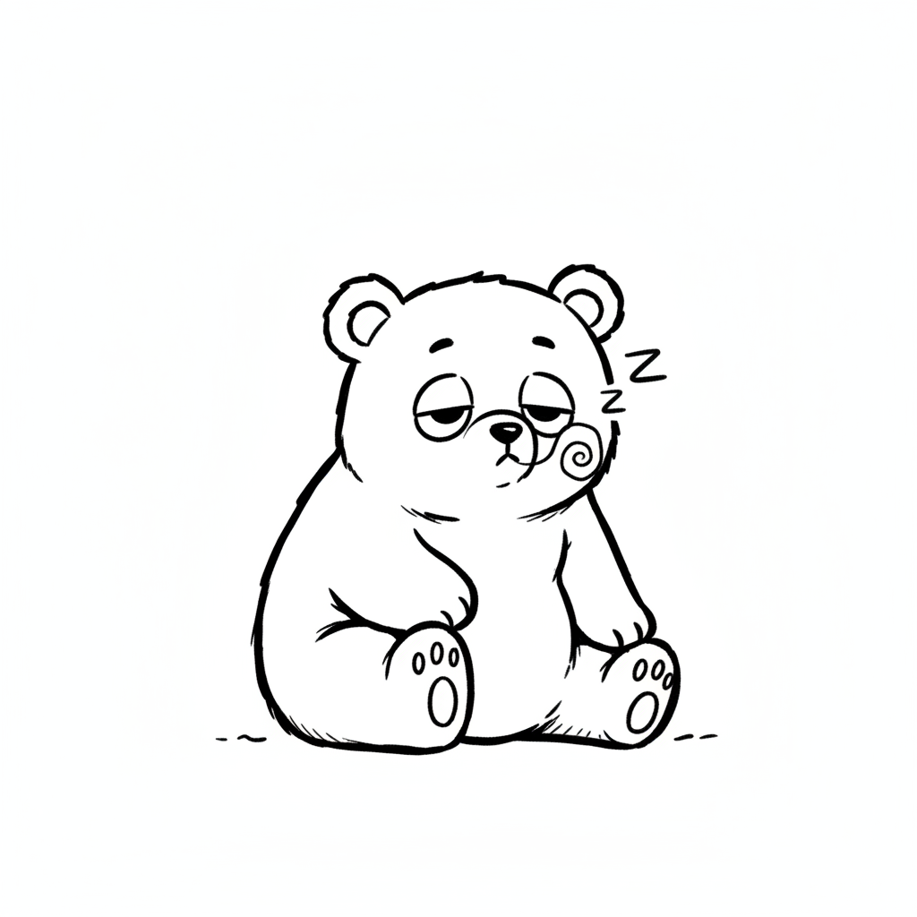 Ein müder Cartoon-Bär sitzt da und schnarcht, mit geschlossenen Augen und einem Z aus der Nase.