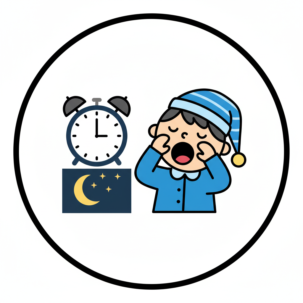 Müdes Kind im Schlafanzug gähnt neben Wecker und Nachtsymbol.