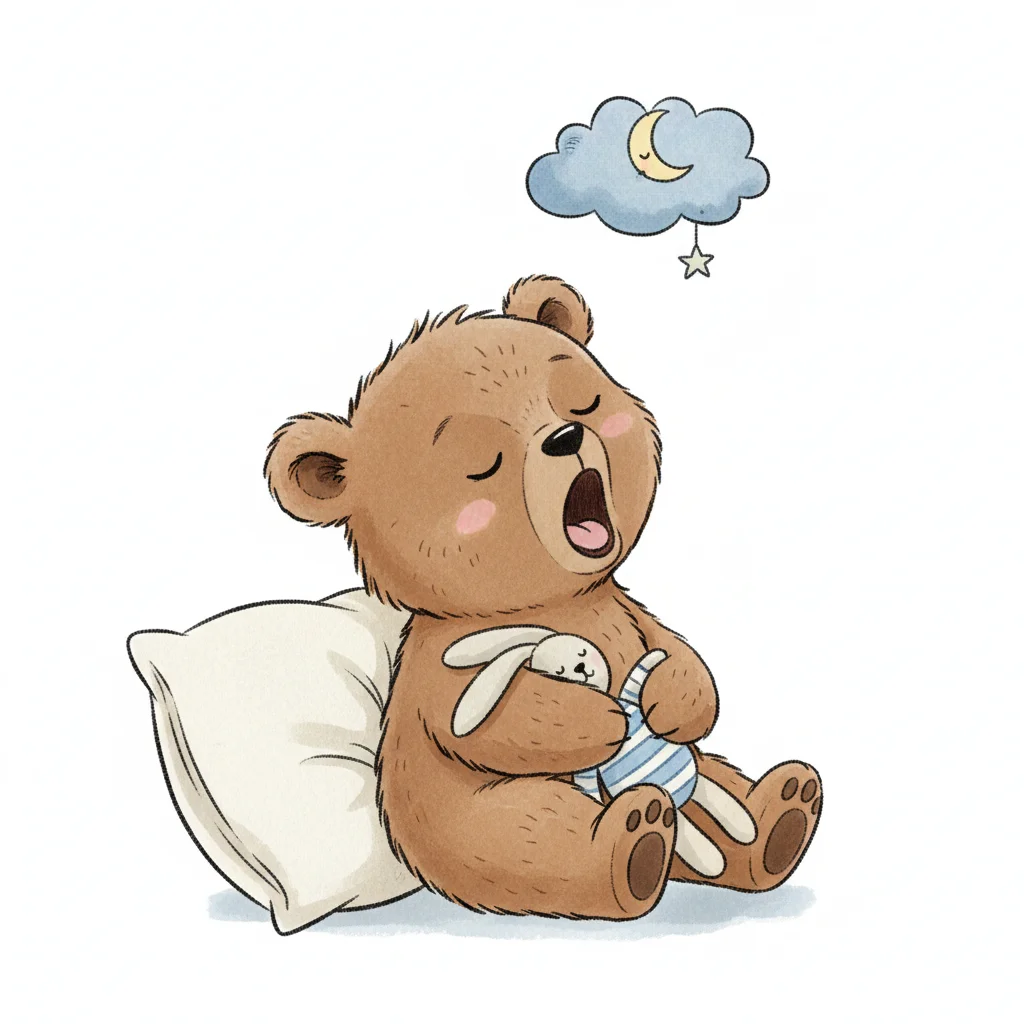 Ein süßer, gähnender Teddybär mit Kuschelhase und Kissen, träumt von Mond und Sternen.