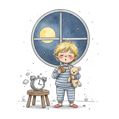 Müdes Kind im Schlafanzug isst Keks mit Teddybär vor Mondfenster. Wecker daneben.