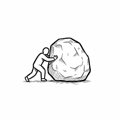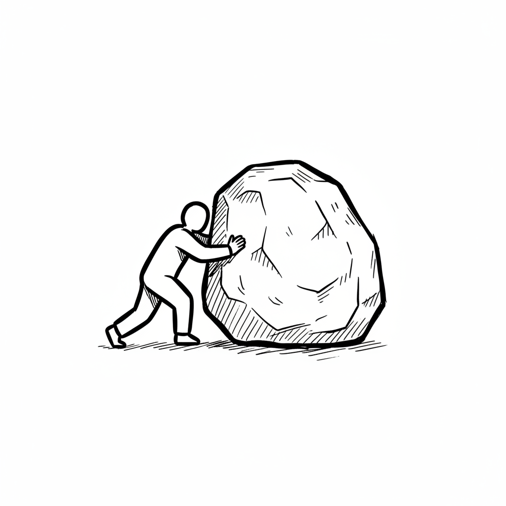 Skizze einer Person, die einen großen Felsen schiebt. Zeigt Mühe und Ausdauer.