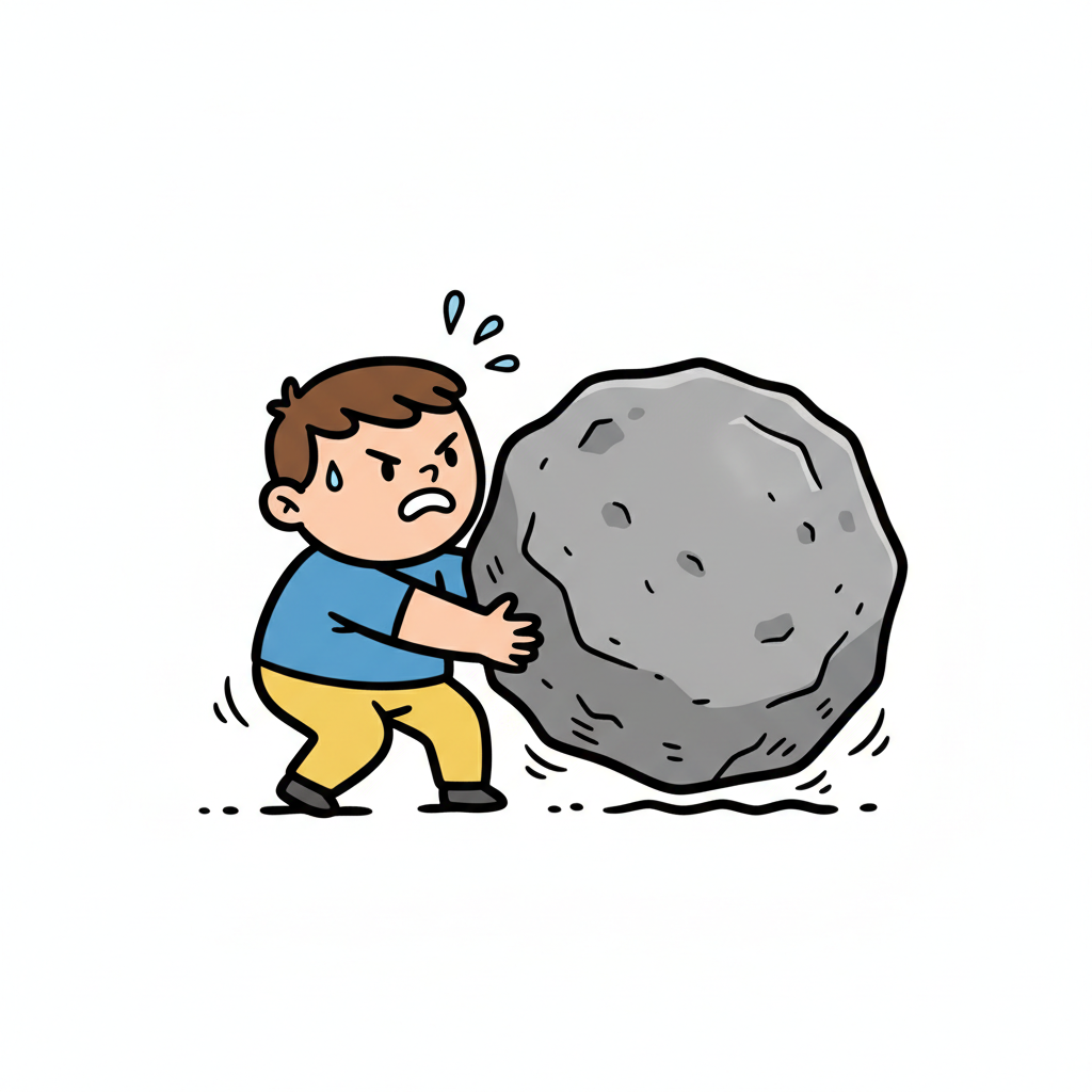 Ein Cartoon-Junge schiebt mit großer Anstrengung einen riesigen Stein. Er schwitzt und kämpft.