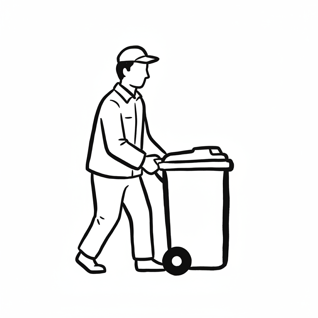 Mann schiebt eine Mülltonne, symbolisiert Müllentsorgung.
