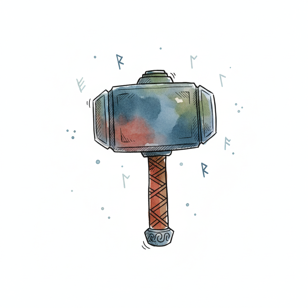 Stilisierter Mjölnir-Hammer in Aquarell-Optik, umgeben von Runen und magischen Partikeln.