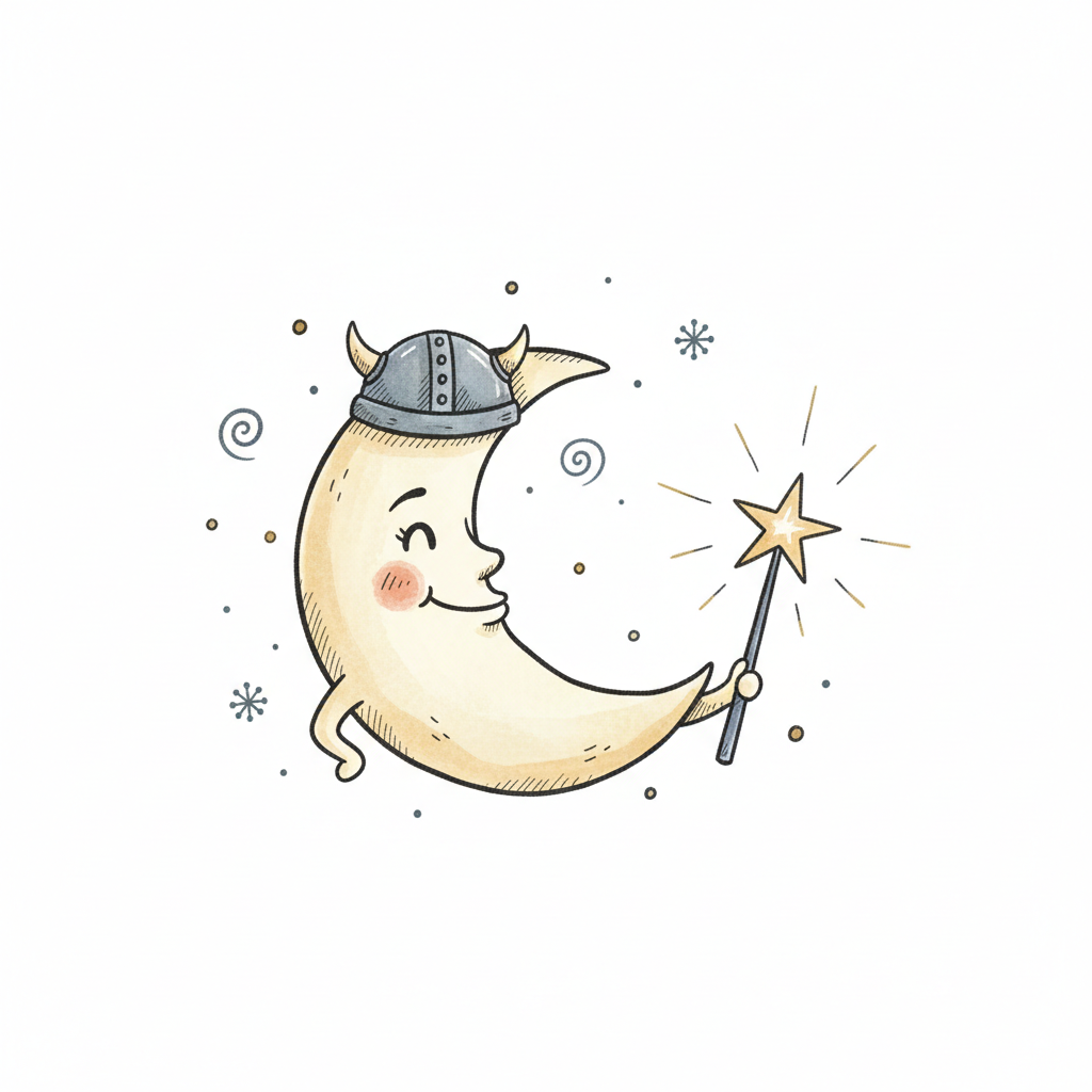 Fröhlicher Mond mit Wikingerhelm und Zauberstab, umgeben von magischen Elementen.