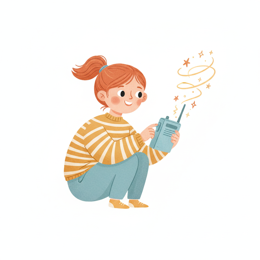 Mädchen mit rotem Zopf hockt und bedient ein Walkie-Talkie, aus dem magische Funken sprühen.