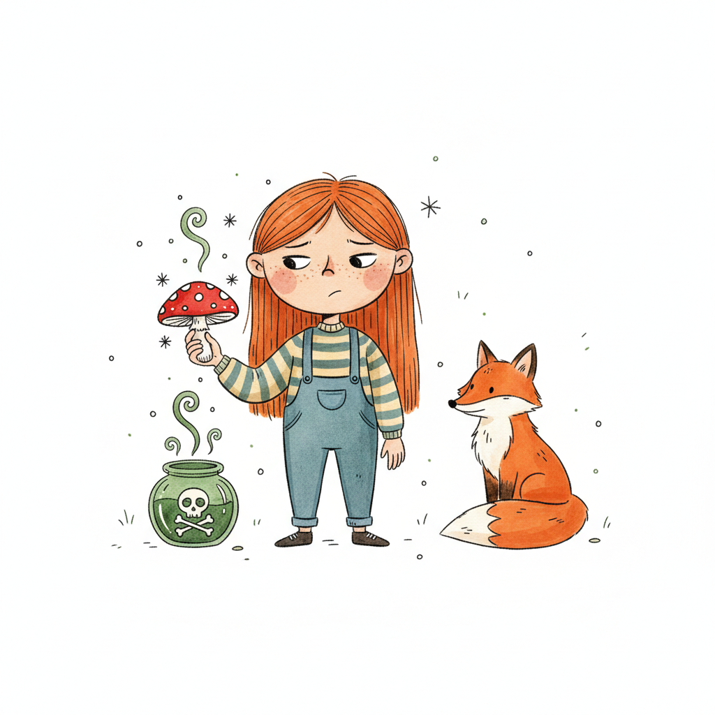 Mädchen mit Pilz und Giftkessel, daneben ein Fuchs. Eine magische, leicht unheimliche Szene.