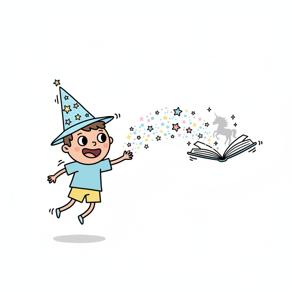 Junge mit Zauberhut lässt Sterne aus seiner Hand in ein Buch fliegen, aus dem ein Einhorn erscheint.